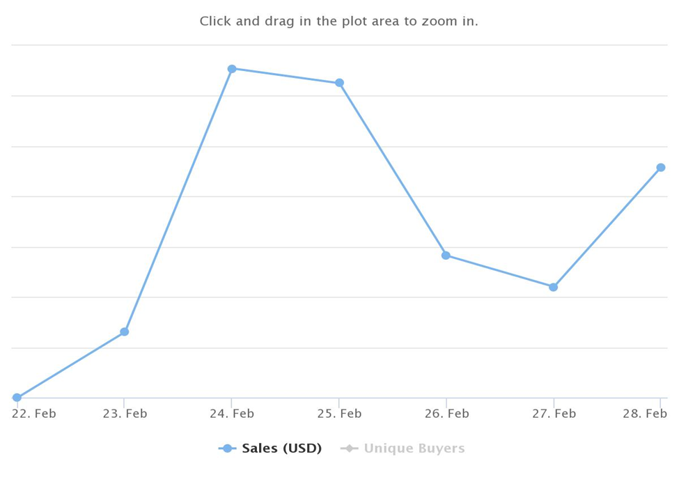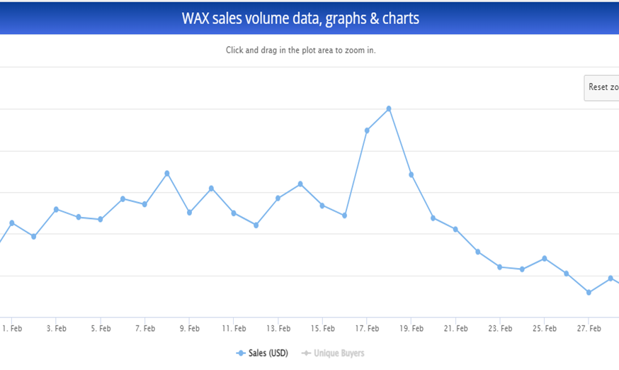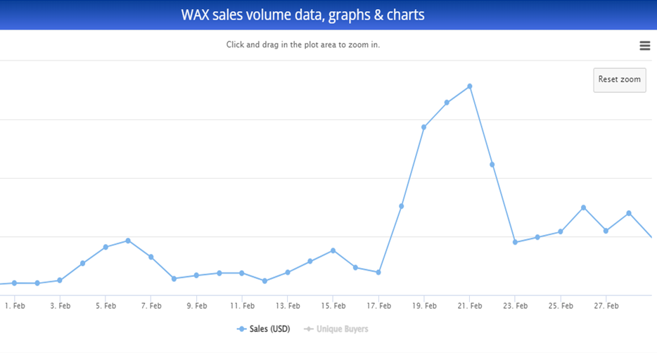 Sponsored SponsoredFor WAX, in February 2022, the single-day highest number of unique buyers was 6,409 on Feb. 17, compared to the single-day highest number of unique buyers in February 2021 which was 2,232 on Feb. 19. The single-day highest transaction count in February 2022 was 73,003 which was recorded on Feb. 2. The single-day highest transaction count in February 2021 was 36,715 which was recorded on Feb. 20.