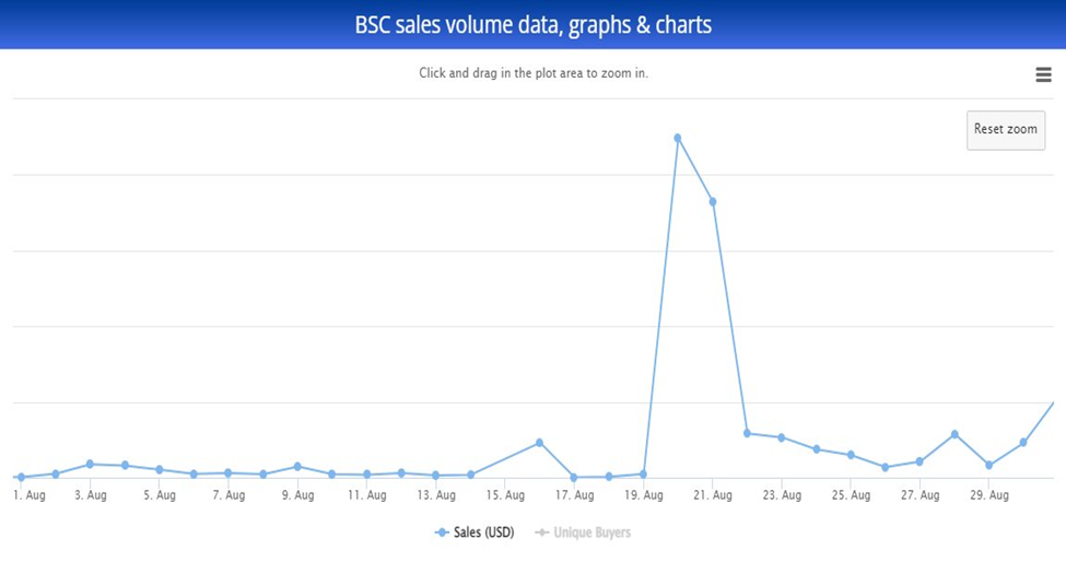 With the crash in the price of cryptocurrencies across the board towards the end of 2021, BSC NFT sales volume took a hit and shed 96% of its total sales volume in August when it recorded just $24,000.