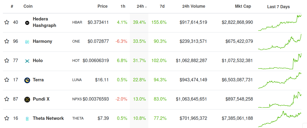 The biggest gainer on Sunday was Hedera Hashgraph, which rose 39.7%. The HBAR token was up 155.6% in the seven days through this report. Hedera Hashgraph is one of the few non-blockchain projects in the top 50. Instead of blocks, it uses a graph consensus model. The project has been gaining industrial interest of late.