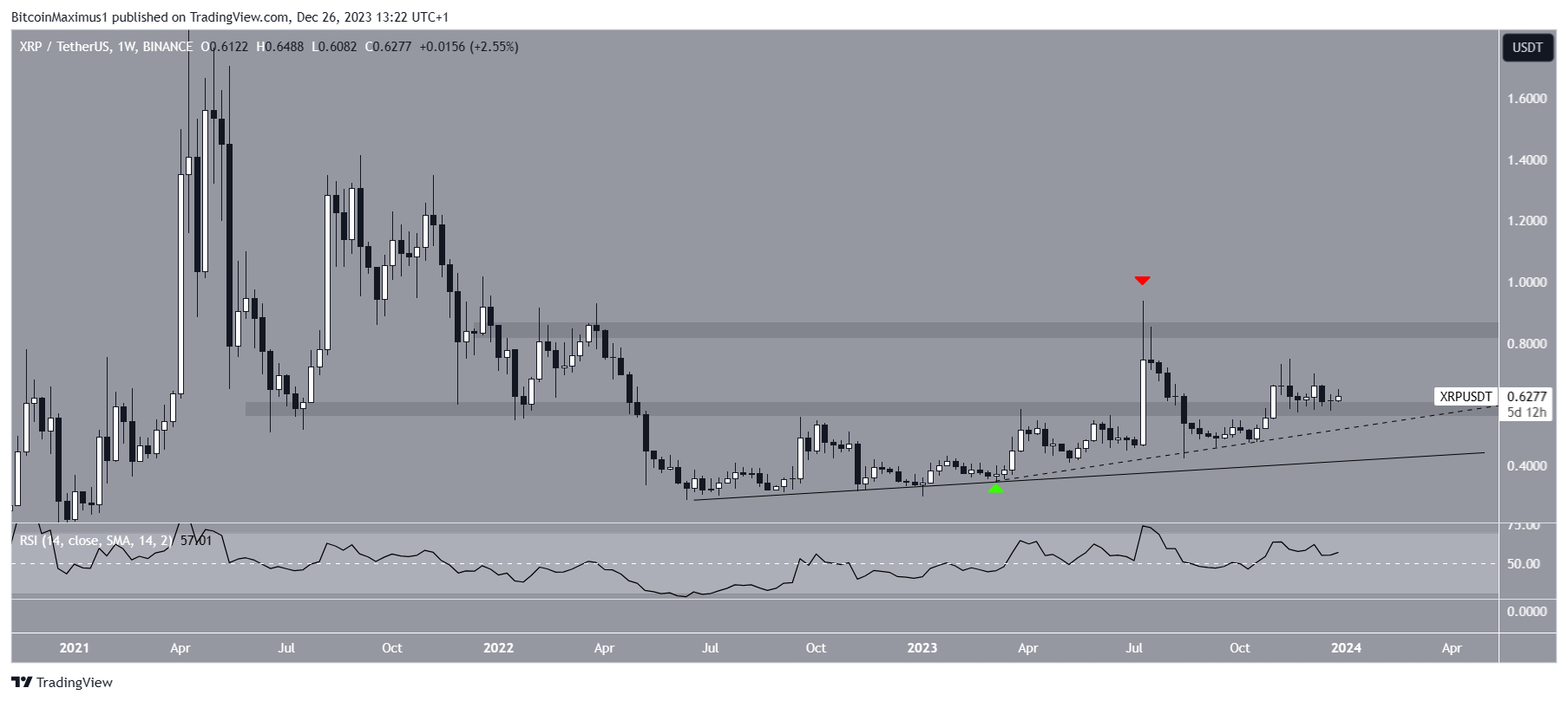 The line has been validated numerous times, more recently in March 2023 (green icon). Since then, XRP has increased alongside a steeper ascending support trend line.