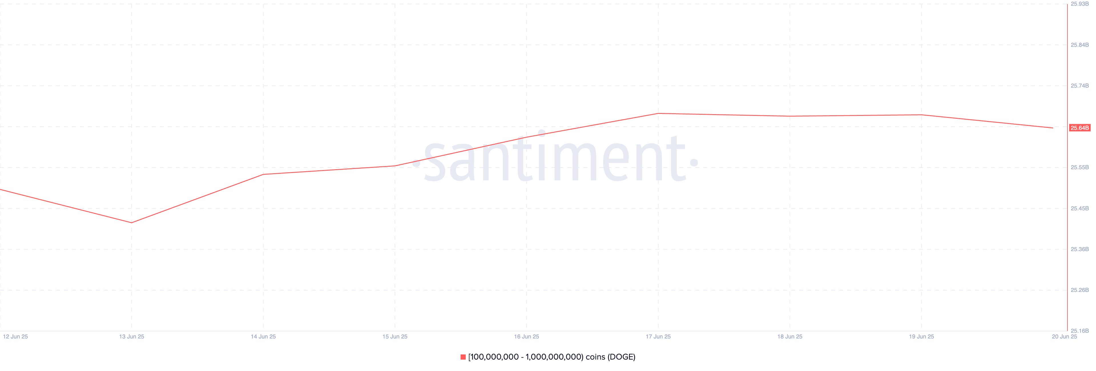 Top meme coin DOGE has also drawn increased attention from crypto whales this week. On-chain data from Santiment reveals a surge in accumulation by large holders holding between 100 million and 1 billion DOGE.