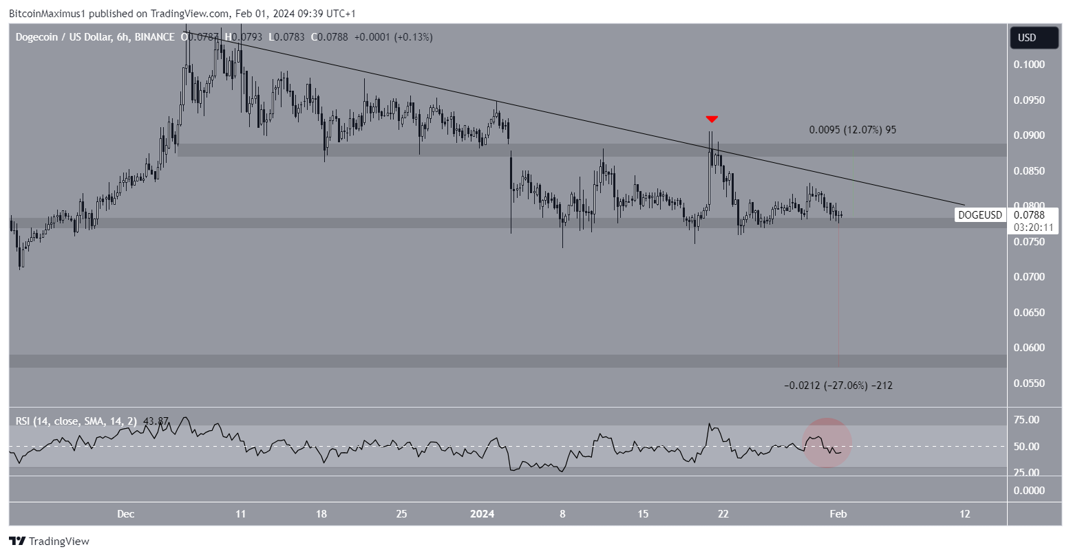 The six-hour time frame technical analysis shows that DOGE has fallen under a descending resistance trend line since December 2023. When combined with the $0.077 horizontal support area, this created a descending triangle, considered a bearish pattern.
