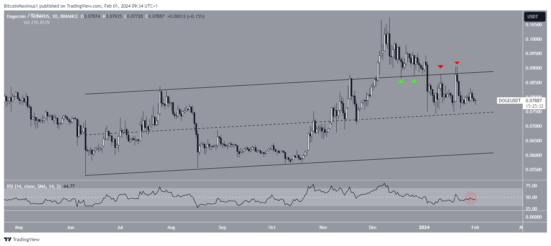 The technical analysis of the daily time frame shows that the DOGE price has fallen since reaching a high of $0.107 on December 11, 2023. The downward movement caused a decrease inside an ascending parallel channel that had existed since June 2023.
