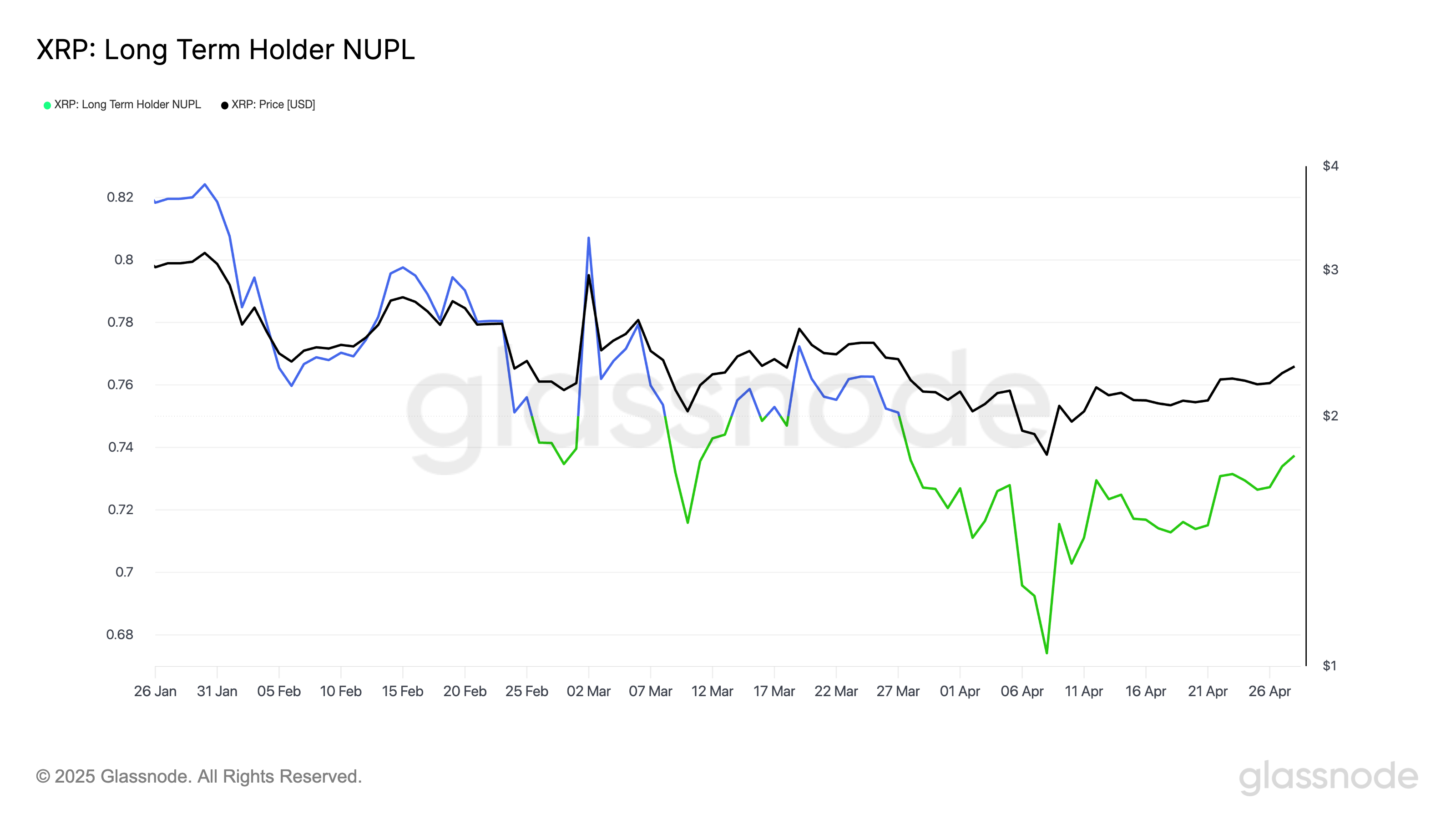 XRP Long-Term Holders Net Unrealized Profit/Loss (NUPL) is currently at 0.73. This places it firmly in the “Belief – Denial” stage of the market cycle. The indicator measures the average unrealized profit among long-term holders.