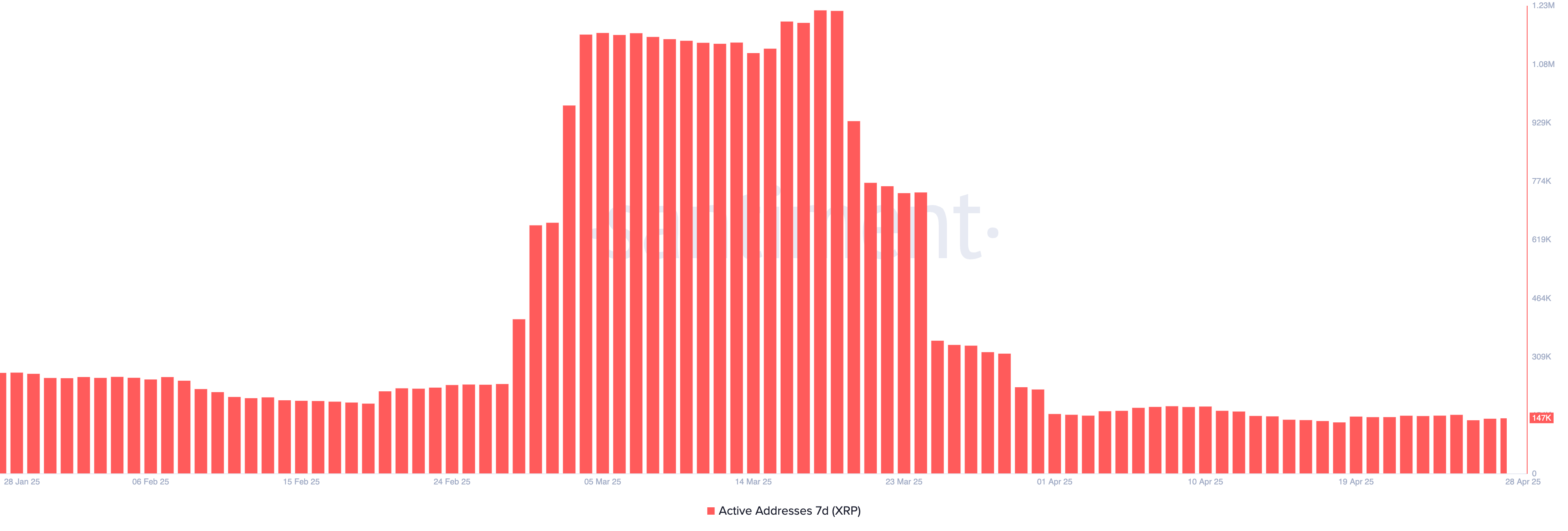 XRP’s 7-day active addresses have dropped significantly, currently at 147,000, compared to their all-time high of 1.22 million, which reached March 19.
