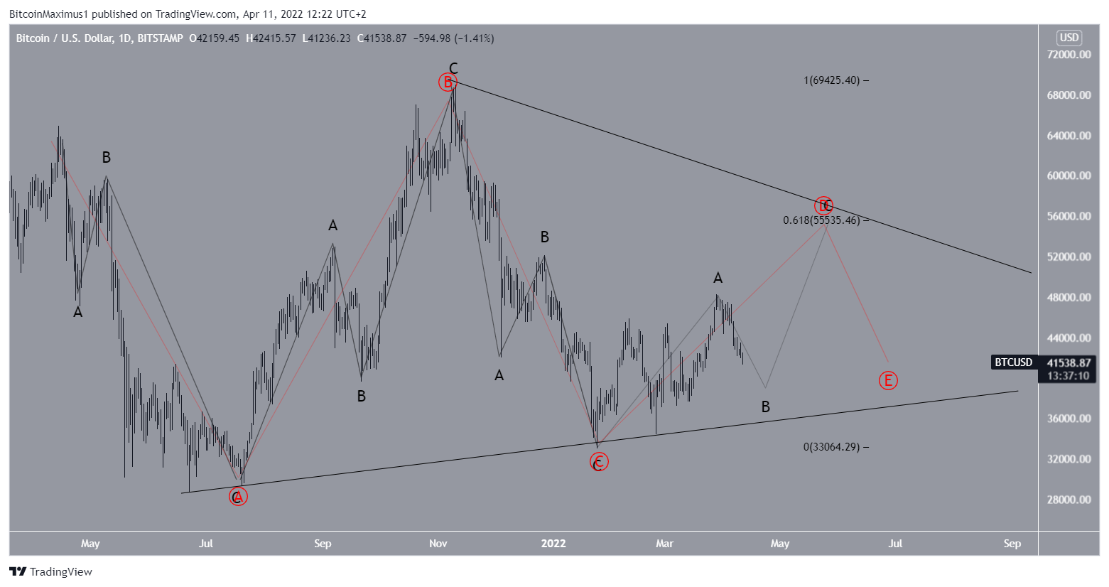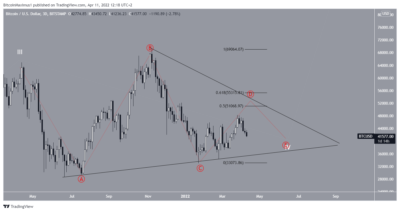 The first potential wave count suggests that wave four is forming inside a symmetrical triangle. In it, BTC is currently in sub-wave D (red). In this possibility, BTC would increase towards $51,000 – $55,250. This is an area created by the 0.5-0.618 Fib retracement support levels. Afterward, another drop would be expected.