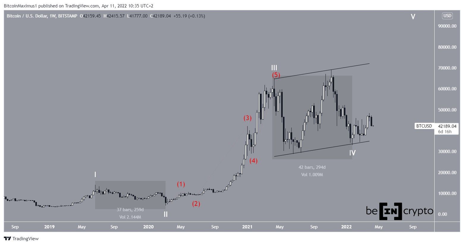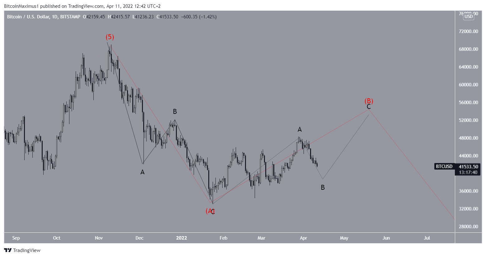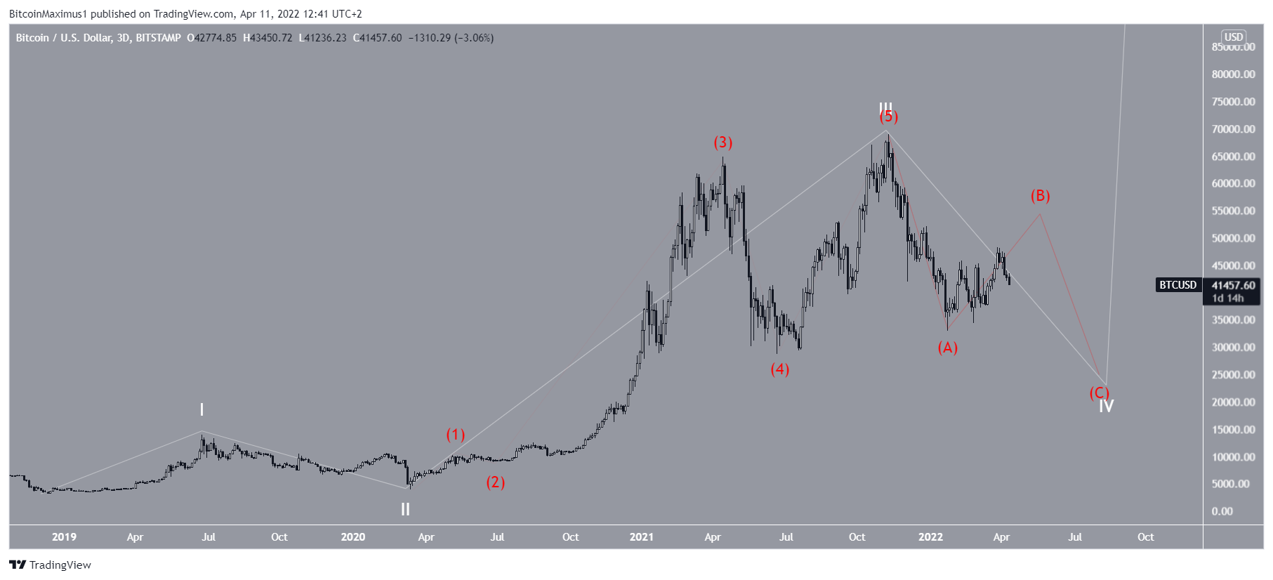 In it, BTC has only completed the first portion of wave four (red). Afterward, another significant decrease will follow, eventually taking the price below $30,000.