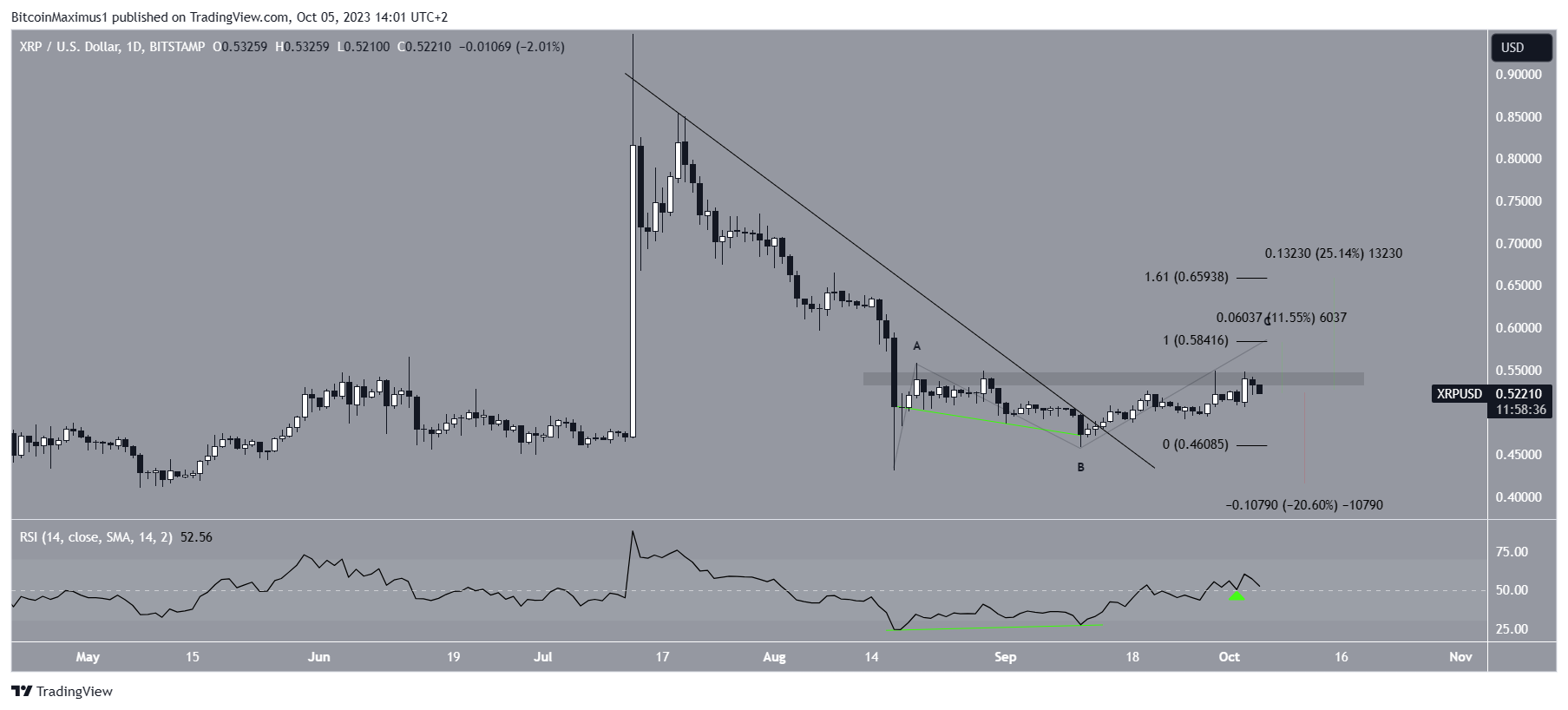 Giving waves A:C a 1:1 ratio would lead to a high of $0.58, an increase of 11% measuring from the current price. If wave C extends to the 1.61 length of wave A, the price could increase by 25% and reach $0.66.