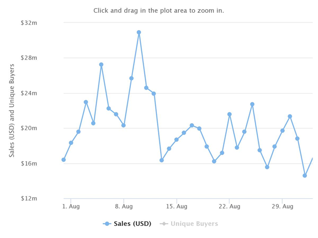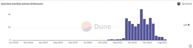 OpenSea volume declined further in August due to an overall bearish crypto market which has impacted global NFT market sales negatively.