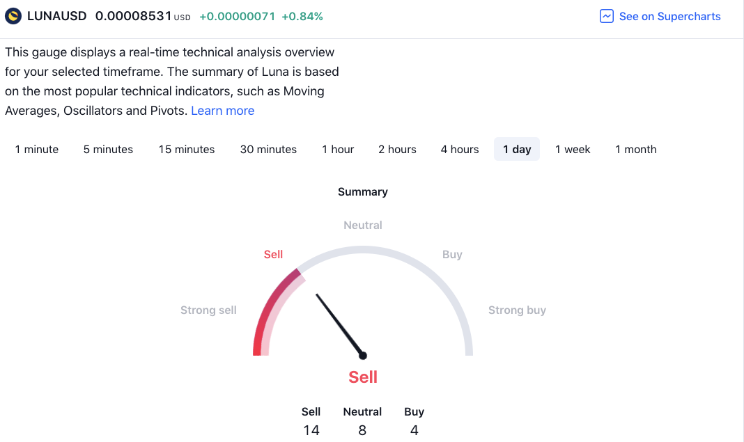 According to TradingView, the $LUNC token is in a ‘Sell’ zone in 14 of the 26 key trading technicals at the time of writing. The exponential and simple moving averages indicate that the token is not offering much support in the short term.