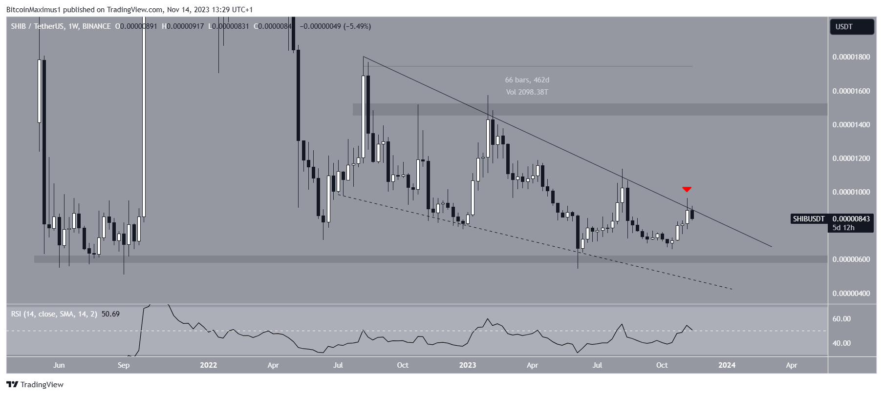 The weekly time frame technical analysis reveals that Shiba Inu has decreased below a descending resistance trend line since August 2022.