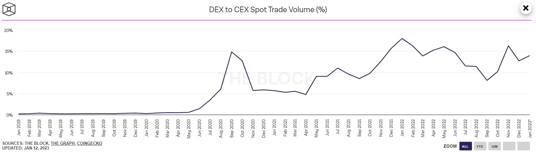 In its December release, CoinMarketCap also noted that there is compelling evidence that DEXs are eroding the CEX market share by citing the DEX-to-CEX spot volume ratios of 2022. However, January figures are relatively lower for decentralized exchanges.