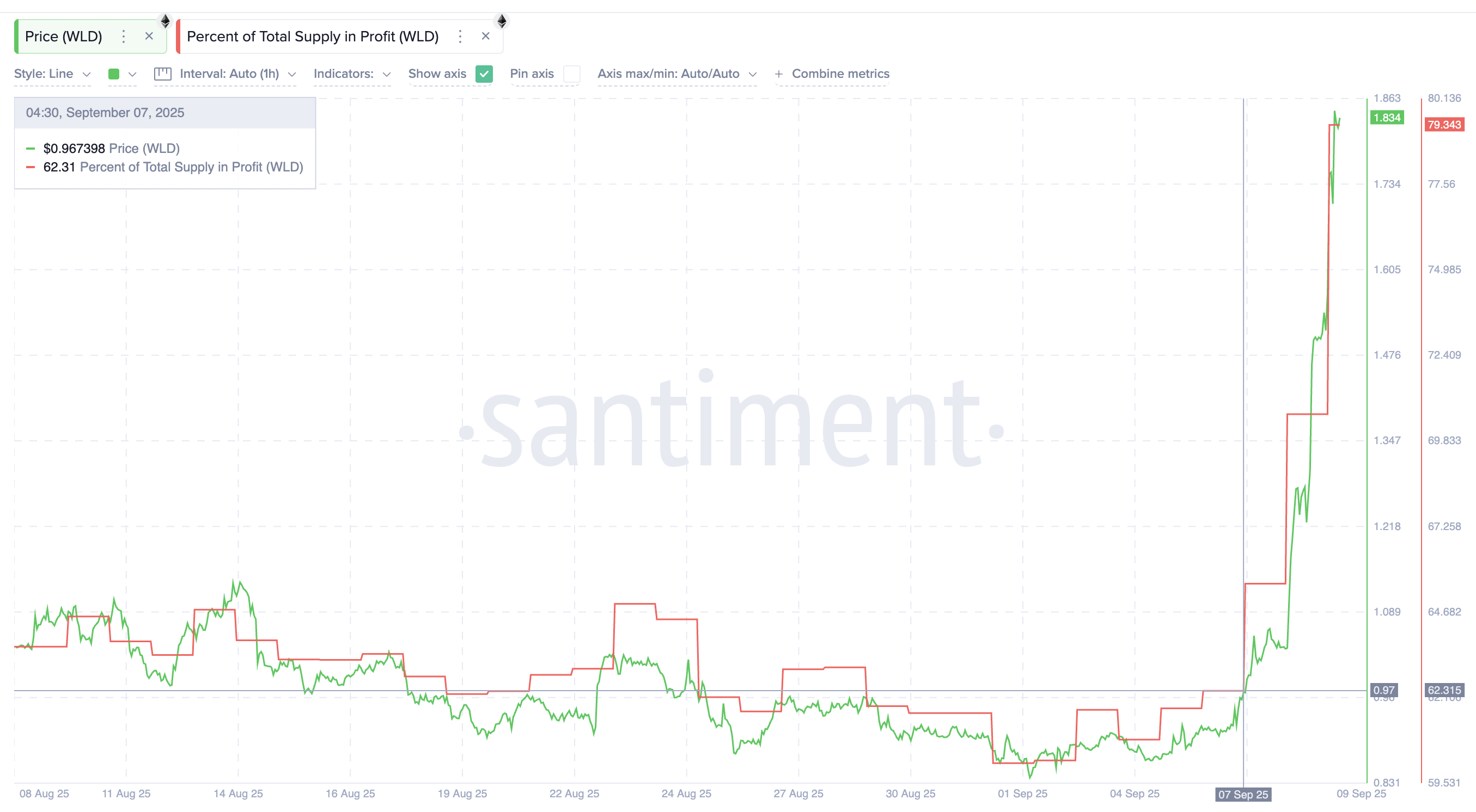 One red flag comes from the percentage of supply in profit. Between September 7 and 8, the share of WLD in profit jumped from 62.3% to 79.3%. This means nearly 80% of holders are sitting on gains — a setup that usually invites profit-taking.
