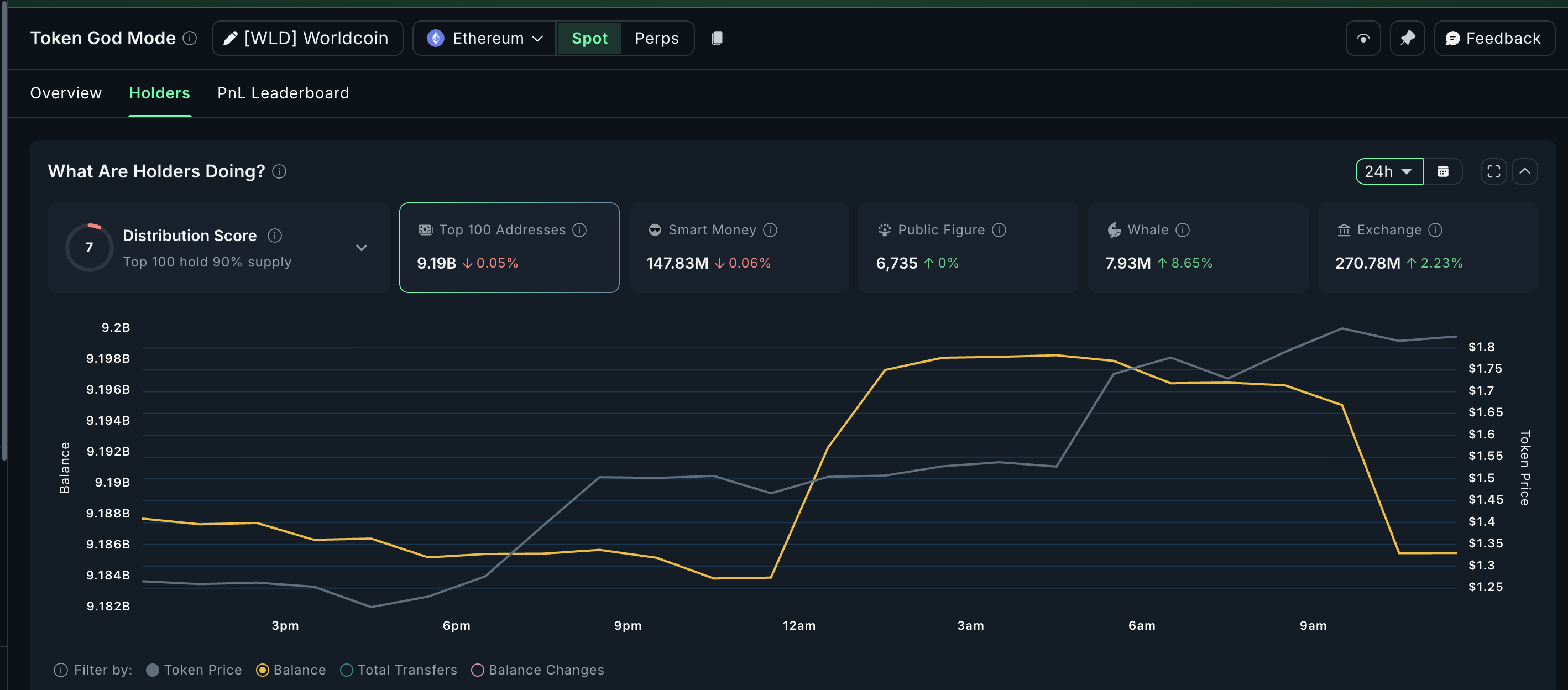 Meanwhile, whales have been adding. Their holdings climbed from 7.30 million to 7.93 million WLD, a net increase worth about $1.15million.