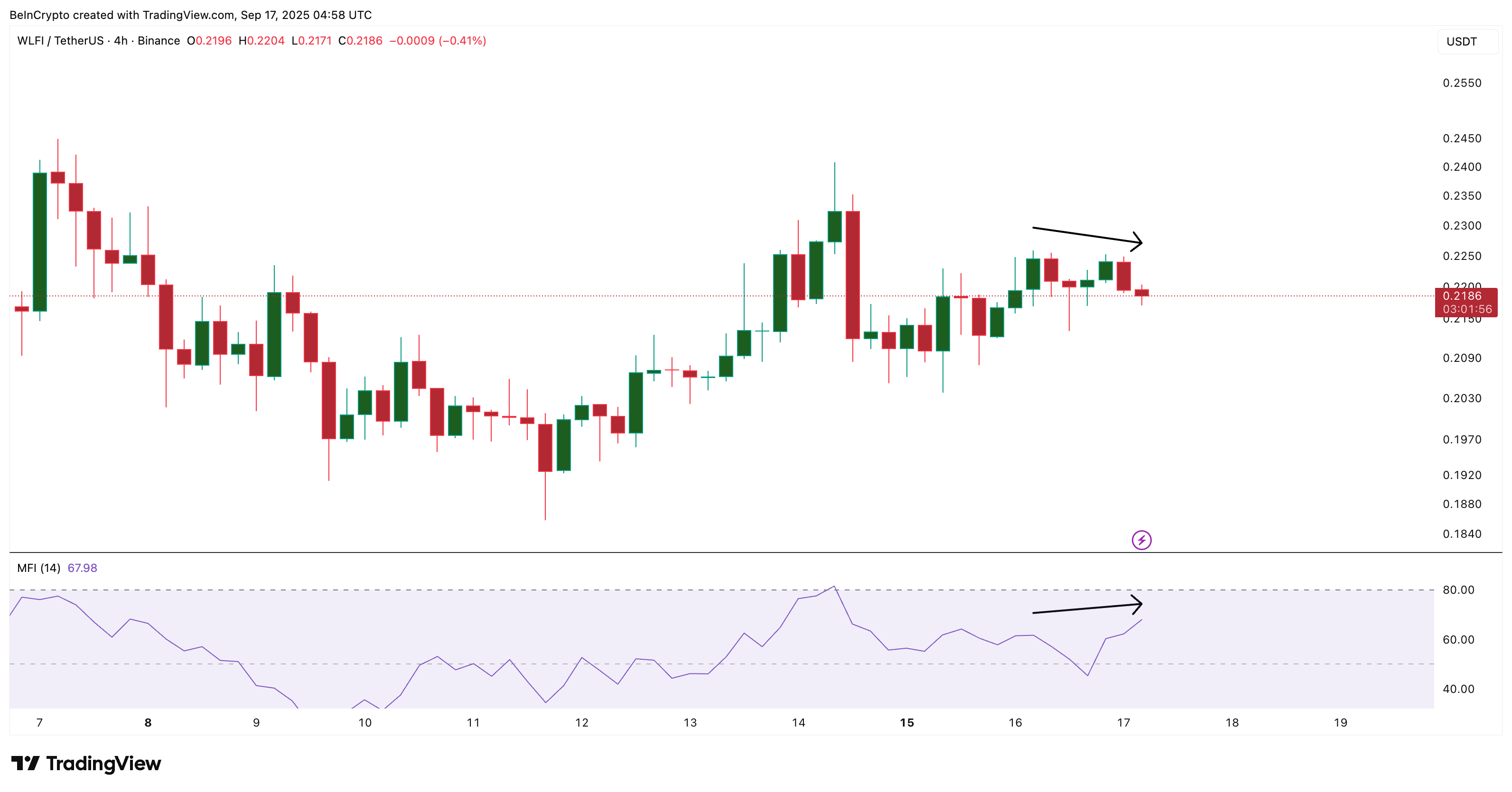 On this timeframe, the WLFI price is trading inside an ascending triangle, a bullish continuation pattern that often forms when demand absorbs supply over time. This setup mirrors the on-chain picture: fewer tokens on exchanges and rising MFI suggest that buyers are pressing higher, even as sellers try to cap the move.