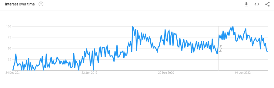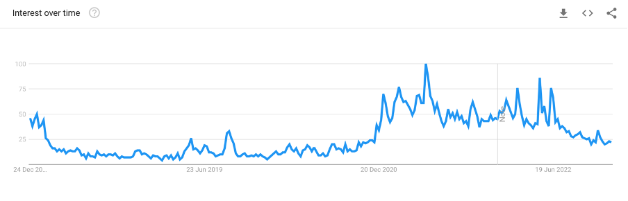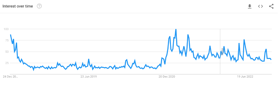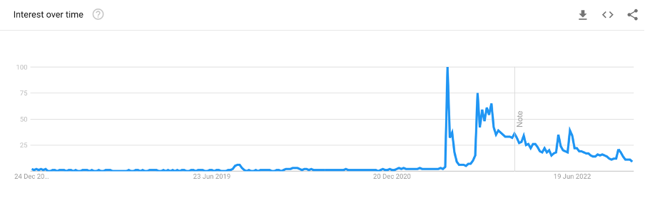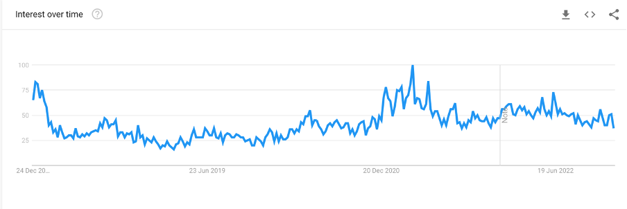 The metric here peaked (a value of 100 is the peak popularity for the term) in the 2017-18 period. However, it has declined since. This is due to various factors, including exchange collapses and stricter regulations.