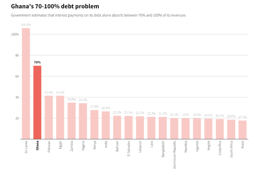 Like in other African countries, Ghana has been a victim of rising inflation and debt. Revenue earned by the government used to offset pending debts has risen to 70%: