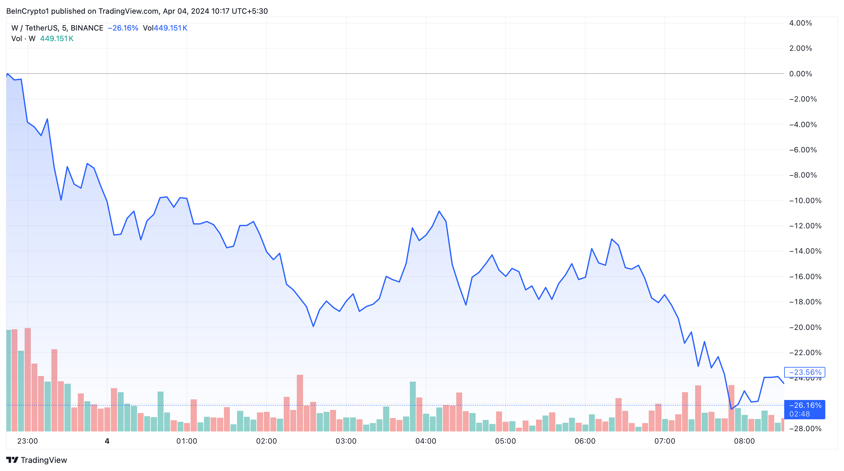 Amidst the cryptocurrency market downturn, the Wormhole token plummeted by about 26% from its peak. This decline followed the much-anticipated airdrop event, which distributed 617.3 million W tokens to over 400,000 wallets.