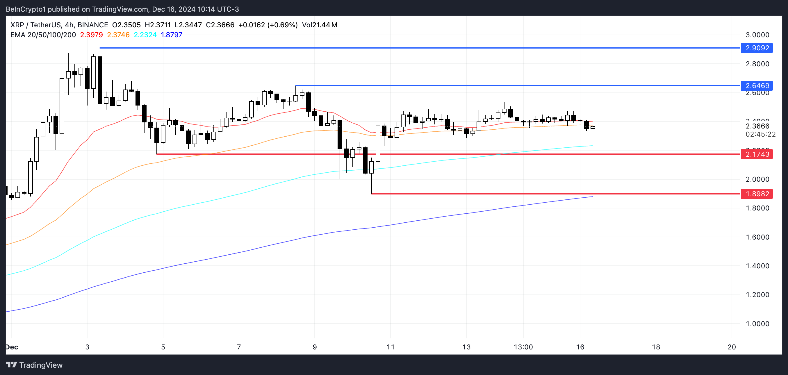 The narrowing EMA lines highlight a pivotal moment for XRP, with upcoming moves depending on whether buyers or sellers gain the upper hand.