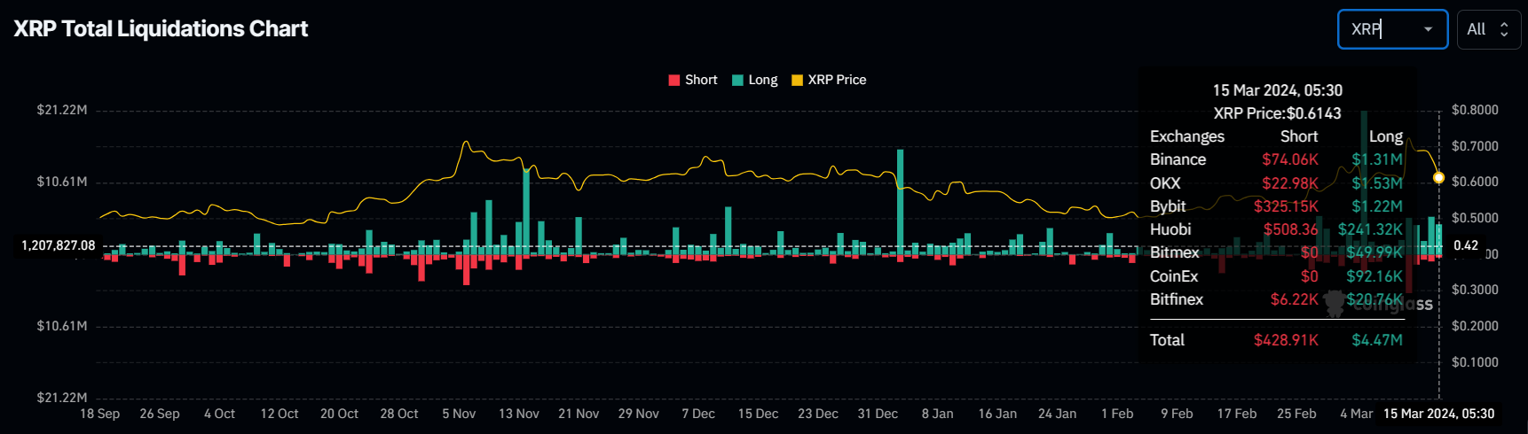 Long contracts pining for an increase in XRP price have been losing money as liquidations have dominated the market. In the past 24 hours, over $4.47 million worth of long liquidations have been recorded.