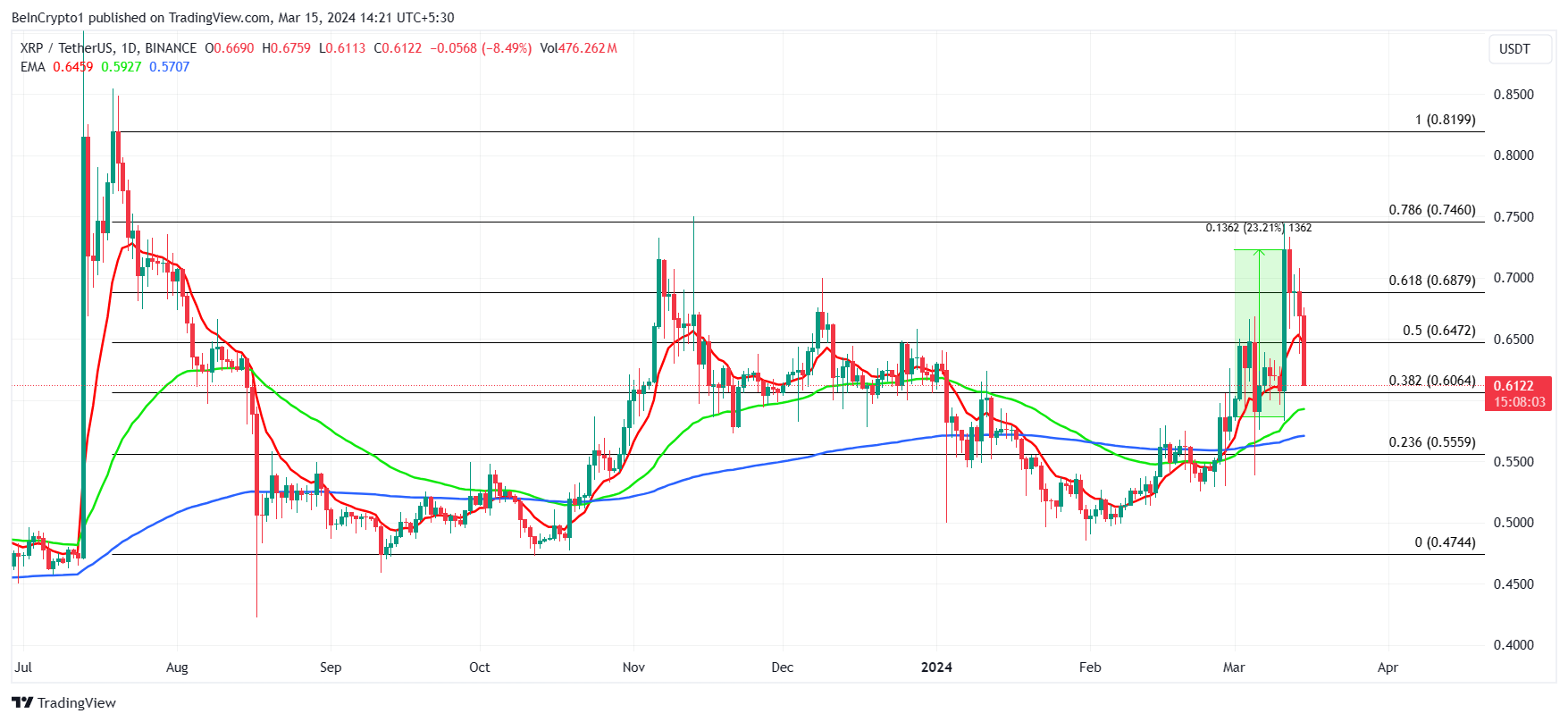 XRP price is trading at $0.612, dropping by 8.5% in the past 24 hours. As the aforementioned instances make it clear that the altcoin will likely see more decline, it could see a fall to $0.606 and beyond.
