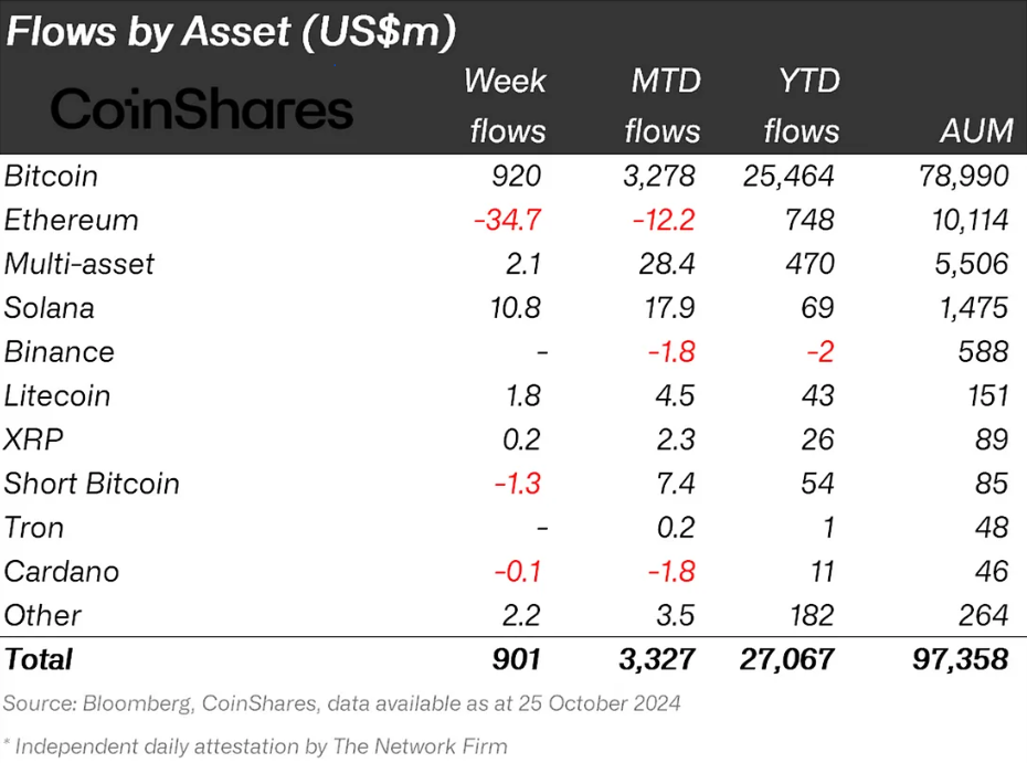 Institutional interest in XRP remained low throughout October, creating headwinds for the asset. Money flowing into XRP in the month of October reached only $2.3 million, significantly lagging behind Solana and Litecoin, which saw inflows of $17.9 million and $4.5 million, respectively.
