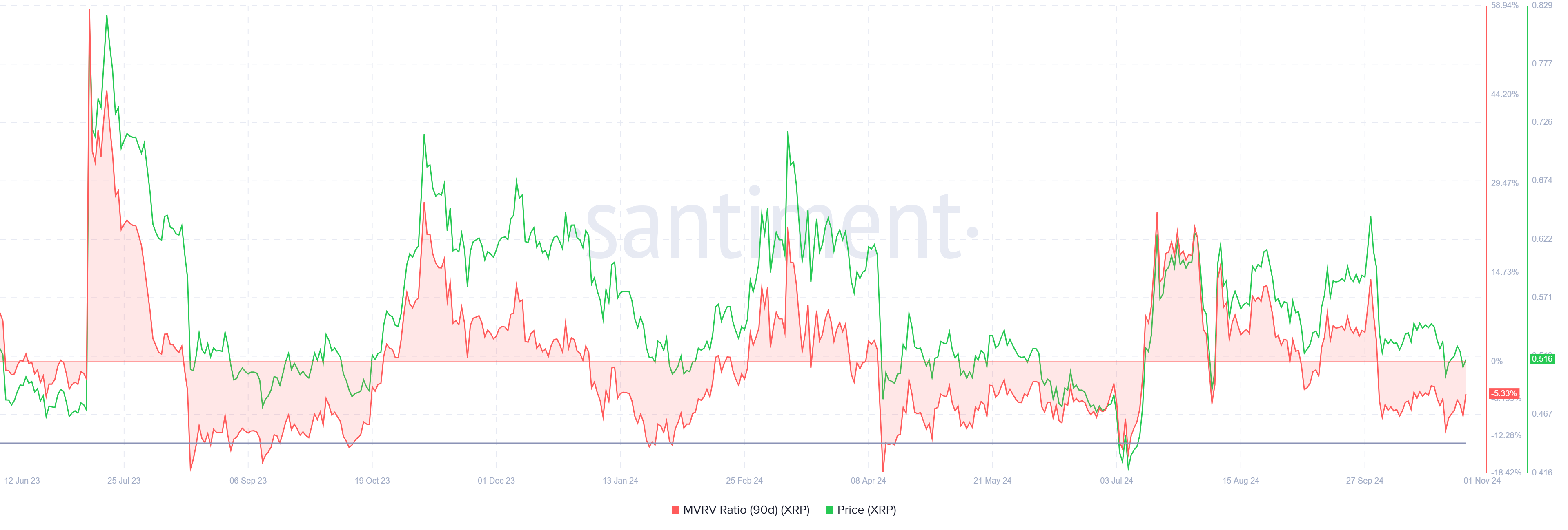 XRP’s macro momentum shows it is currently undervalued, as indicated by the 90-day Market Value to Realized Value (MVRV) ratio. This metric suggests that XRP is trading below its fair value, which can sometimes prompt buying interest.
