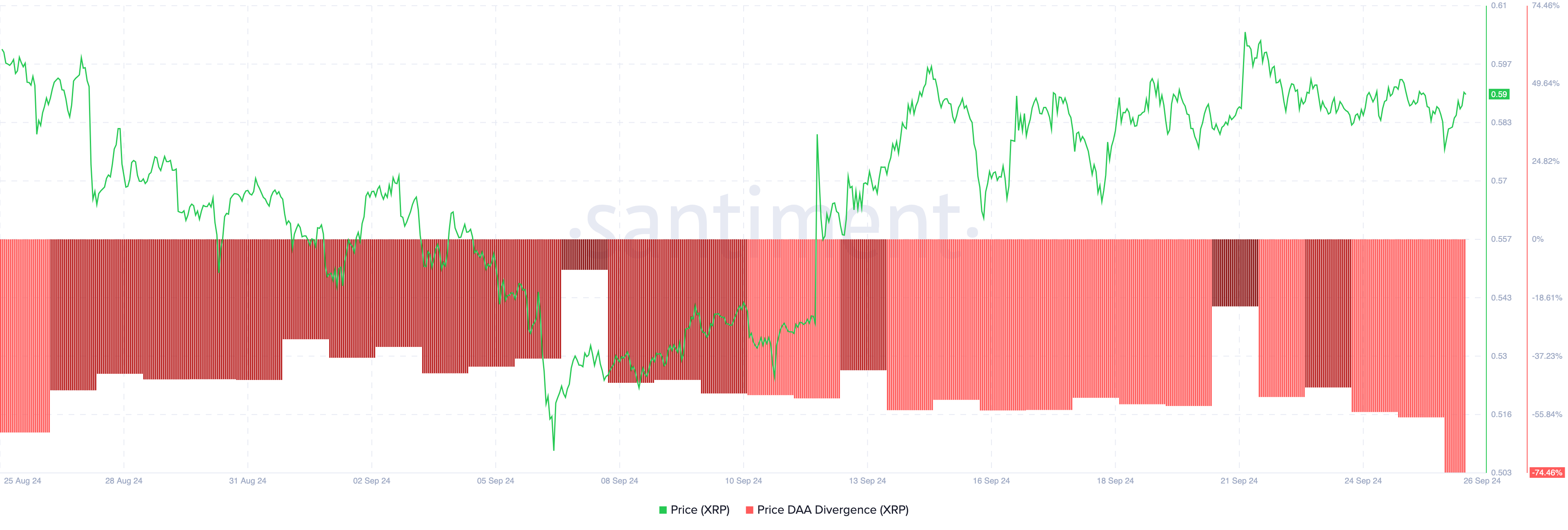 According to Santiment data, XRP’s price Daily Active Addresses (DAA) divergence dropped to -74.46% today. The price DAA shows if user participation on a blockchain is increasing with the price or otherwise.