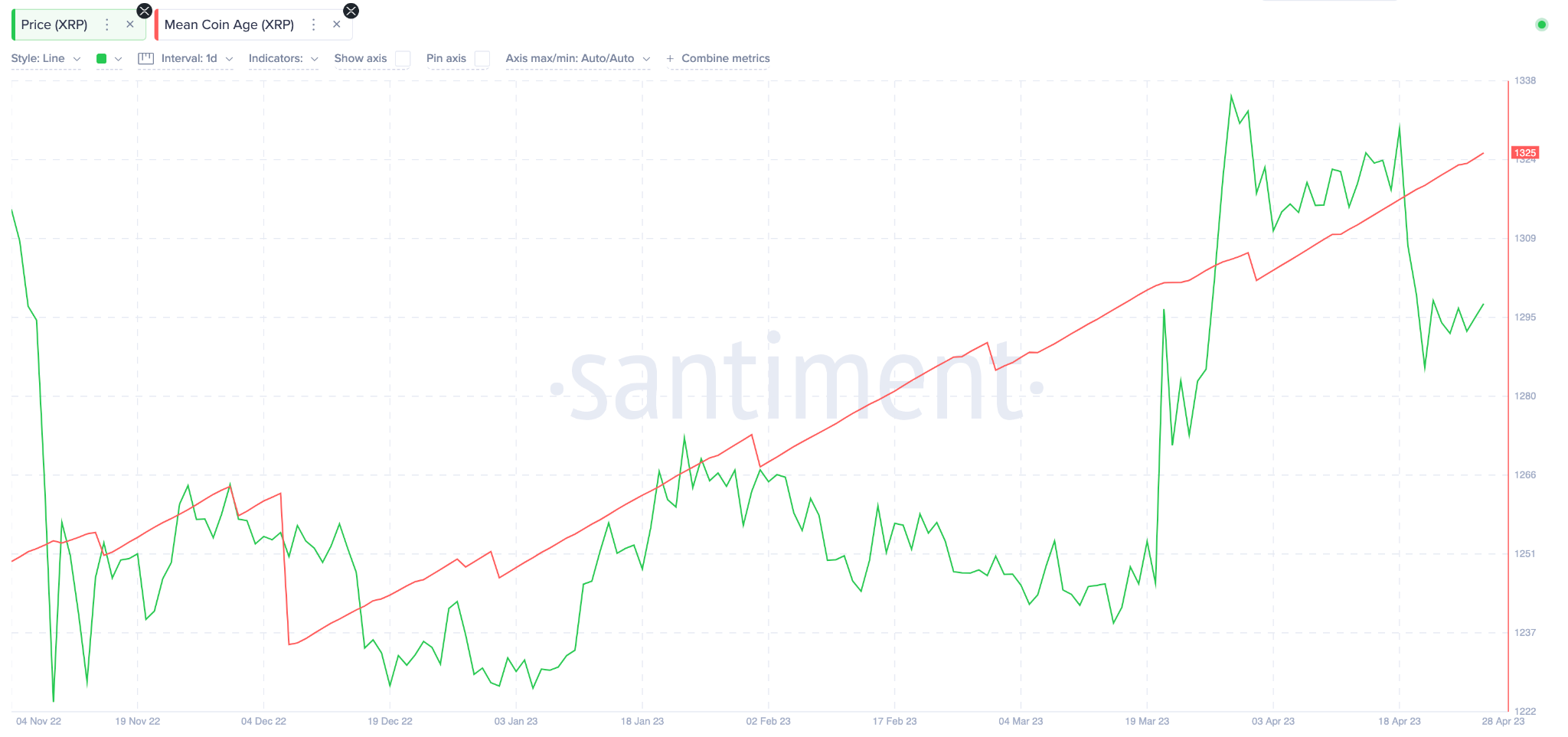 According to on-chain data, long-term holders of XRP are increasingly confident about XRP price prospects. Looking at the chart below, The Mean Coin Age of XRP tokens has increased considerably this month. Since the last drop around Mar. 31, it has risen steadily from 1,301 to 1,325 as of April 25.