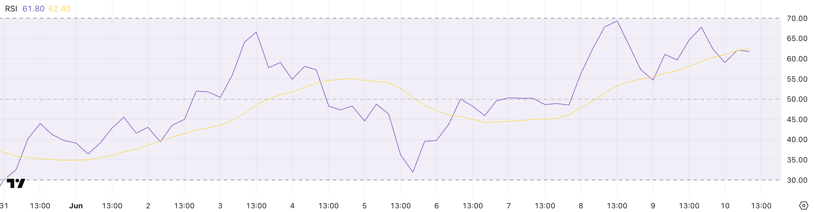 XRP’s Relative Strength Index (RSI) currently stands at 61.6. Over the past two days, it has consistently hovered between 55 and 70.