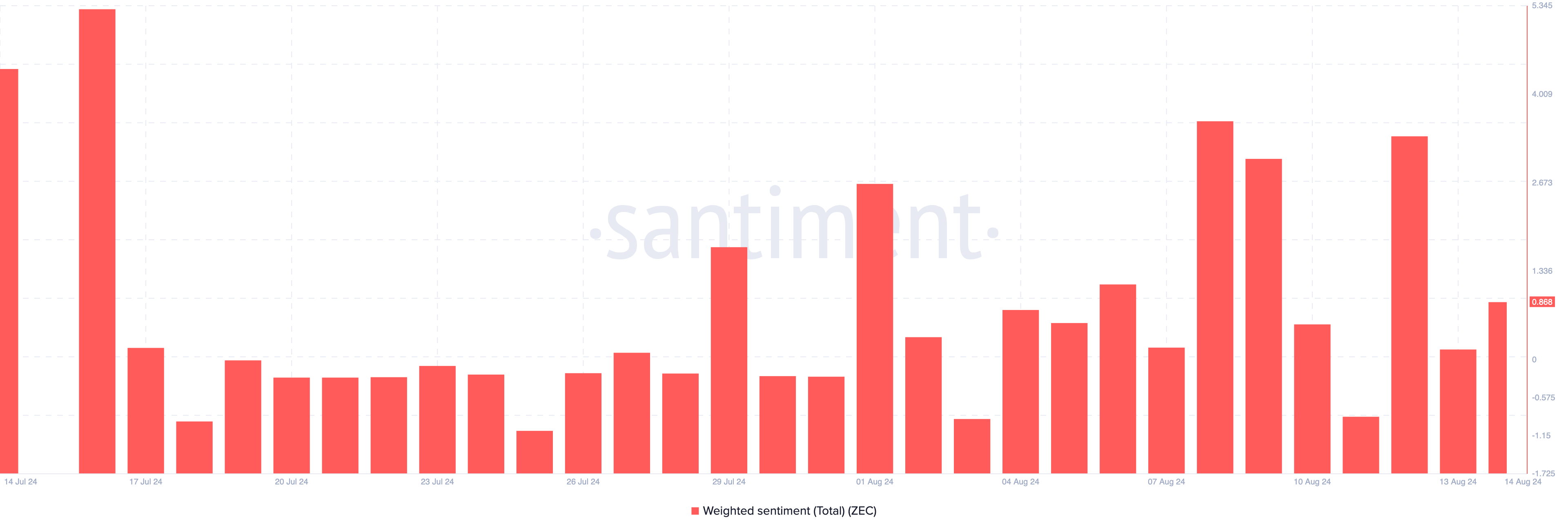 If the Weighted Sentiment reading is positive, then most comments are bullish. However, a negative rating implies that a large part of discussions tilt toward the bearish end. For ZEC, the reading had initially dropped on August 13.