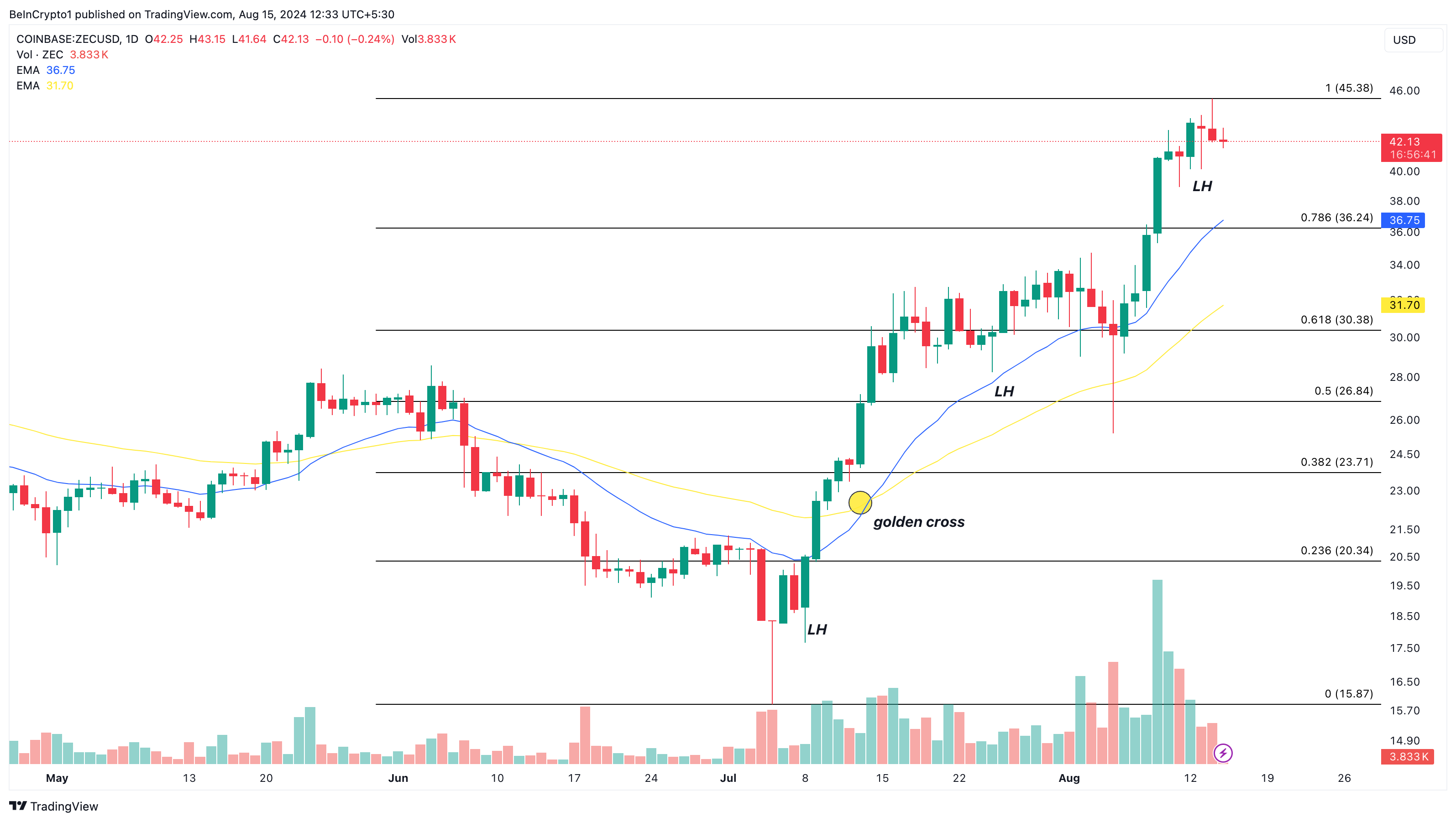 The shorter EMA continues to outpace the longer one, indicating potential for further gains. If this trend holds, ZEC’s price could reach $46 in the short term.