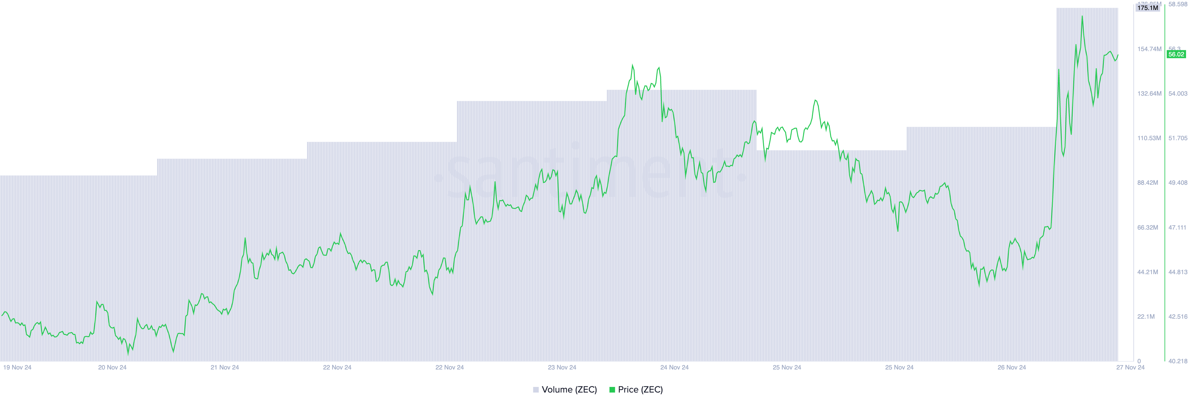 As of this writing, ZEC trades at $56.93, a price it last touched in October 2022. This surge has been accompanied by a significant uptick in trading activity, with volume reaching $175 million over the past 24 hours — marking a 68% increase.