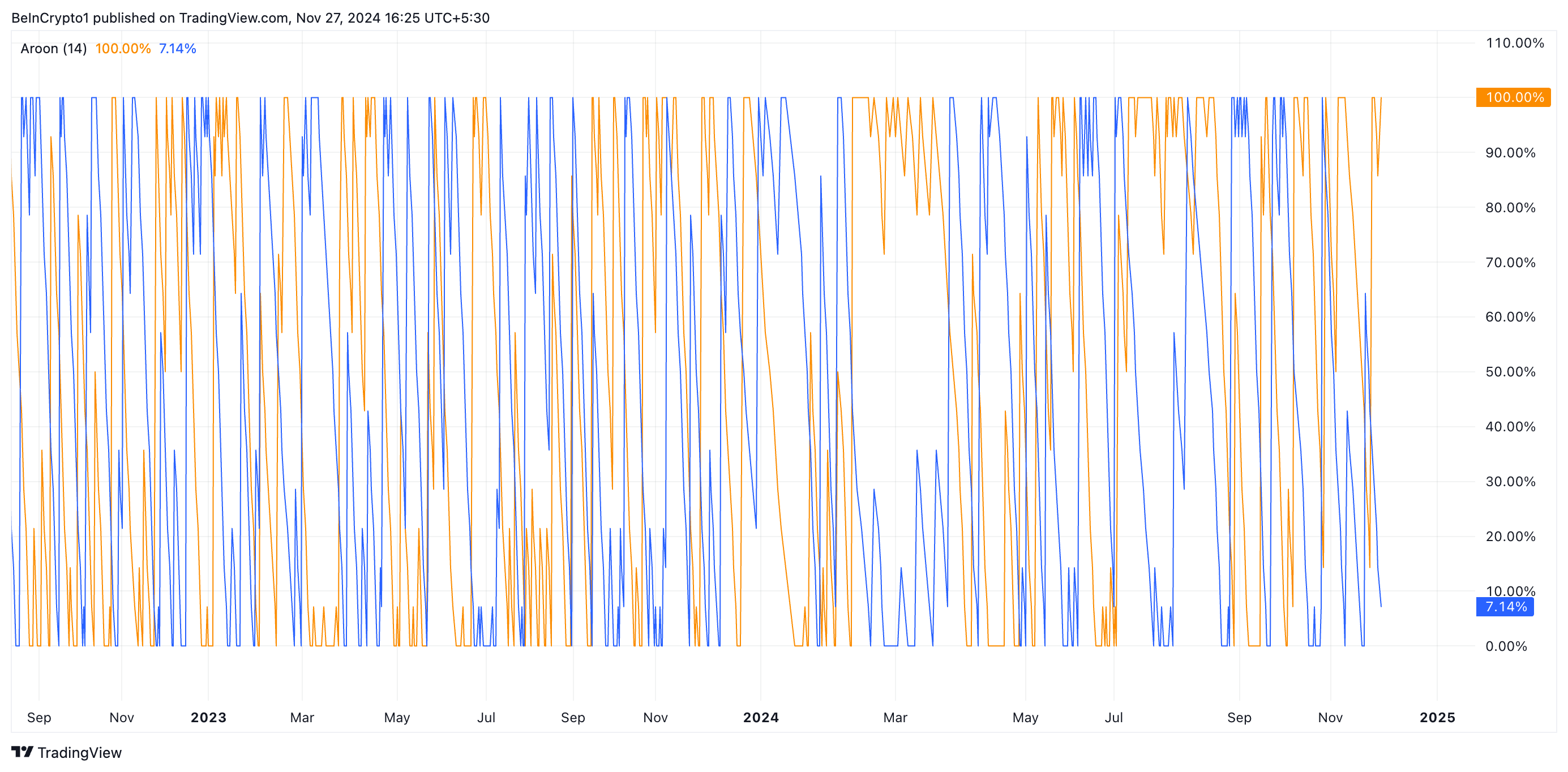 SponsoredZEC’s Aroon Up line on the daily chart confirms the strength of its uptrend, currently standing at 100%. The Aroon Indicator measures trend strength and direction by tracking the time since the highest high (Aroon Up) and the lowest low (Aroon Down) within a specific period.