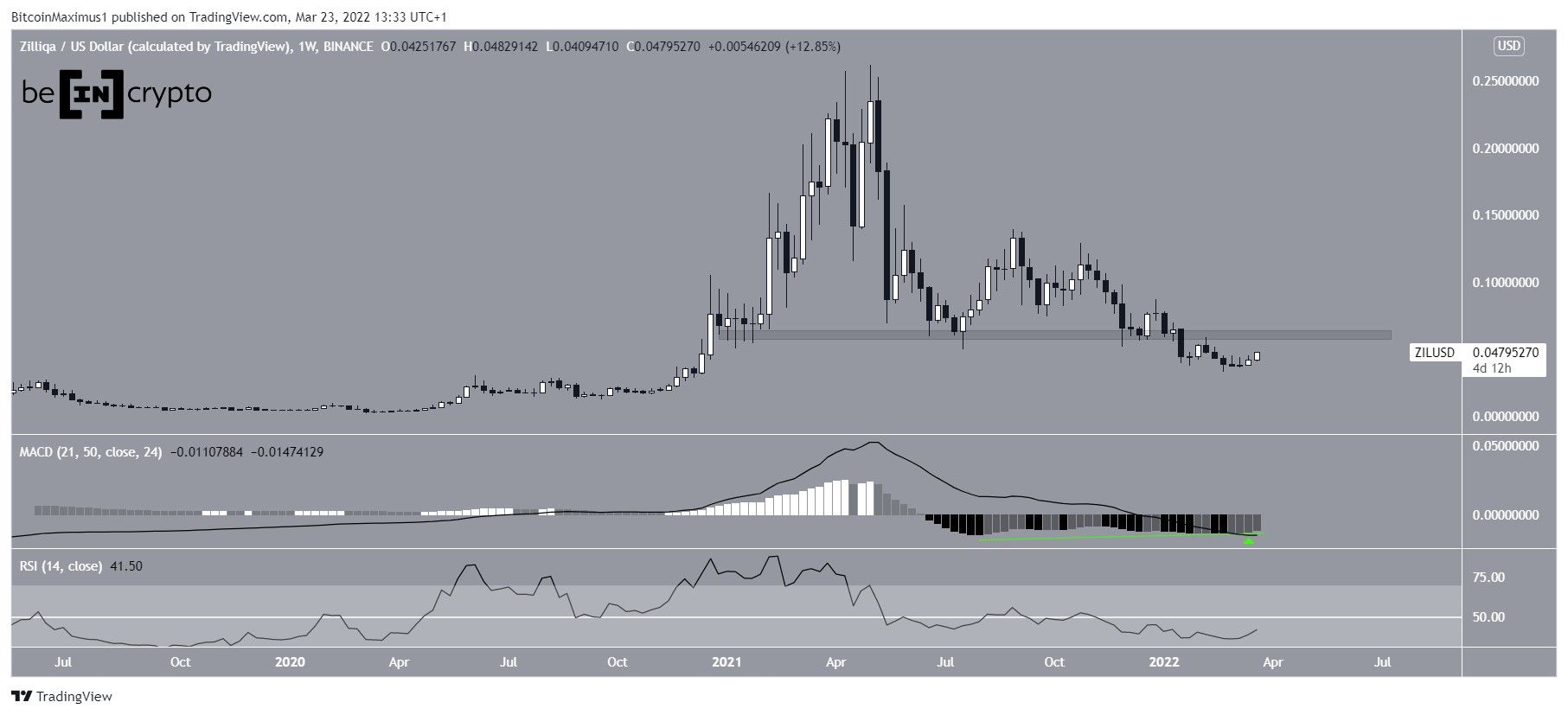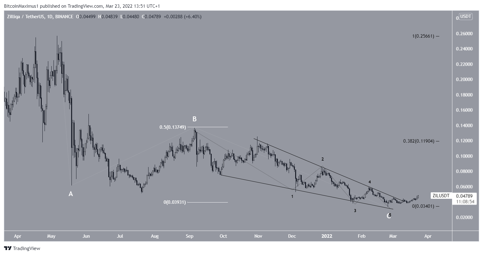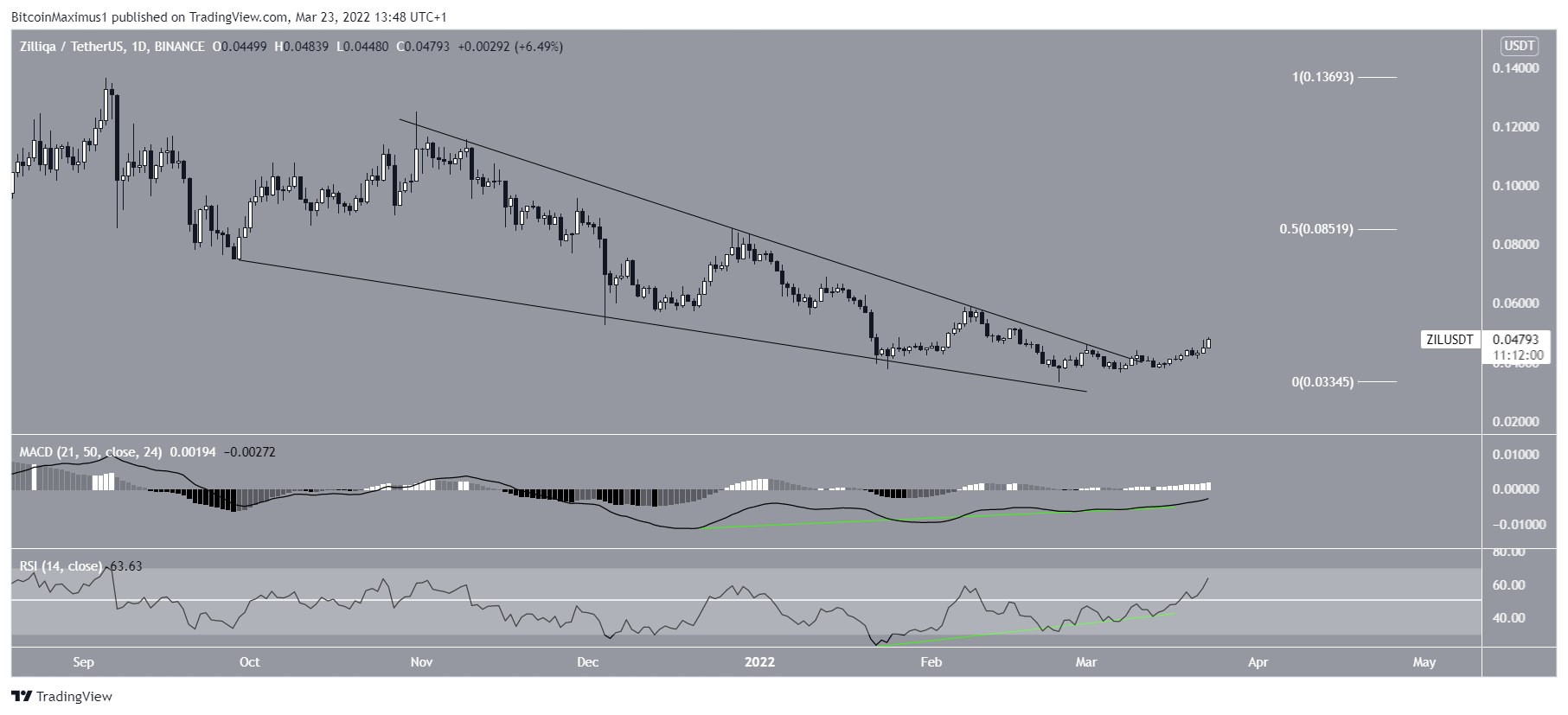 If the ZIL upward movement continues, the two closest resistance areas are at $0.086 and $0.012. The former is the 0.5 fib retracement level (white) of the most recent portion of the drop. It is also a horizontal resistance area. The latter is the 0.382 fib retracement level of the entire decrease since the May 2021 highs. It also coincides with the beginning of the descending wedge.