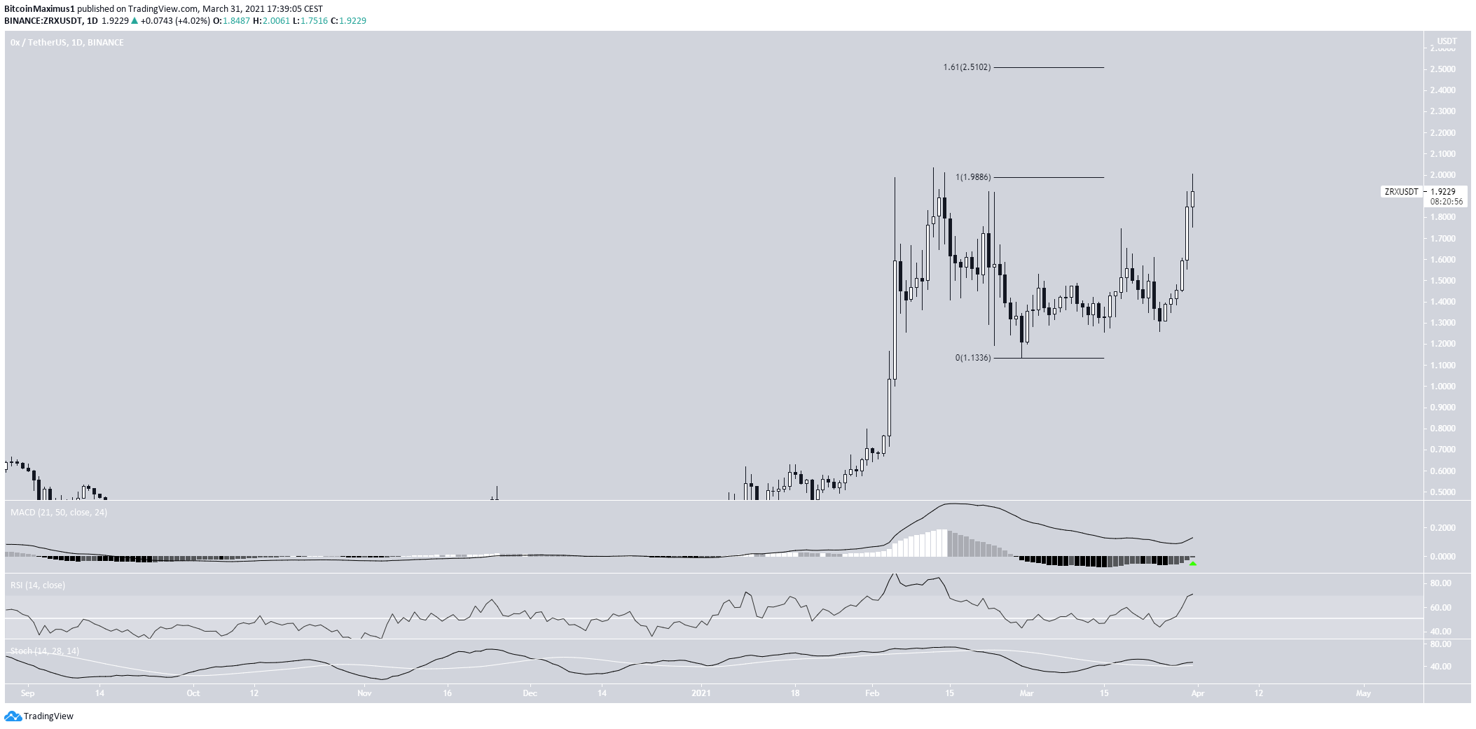 The weekly chart also supports the possibility of a breakout. The main resistance area is $2, and ZRX has never reached a weekly close above it.