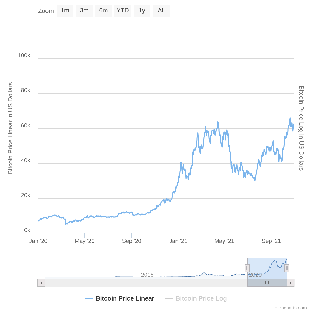 The blue line charts the price in linear terms, with it’s scale on the left, moving up in intervals of $20,000. While the black line charts the price on a logarithmic scale with it’s scale on the right, moving up in multiples of 10X, starting with $0.01, then $0.10; $1; $10; $100; $1,000 and $10,000, with the orange circles highlighting the “bubbles.”