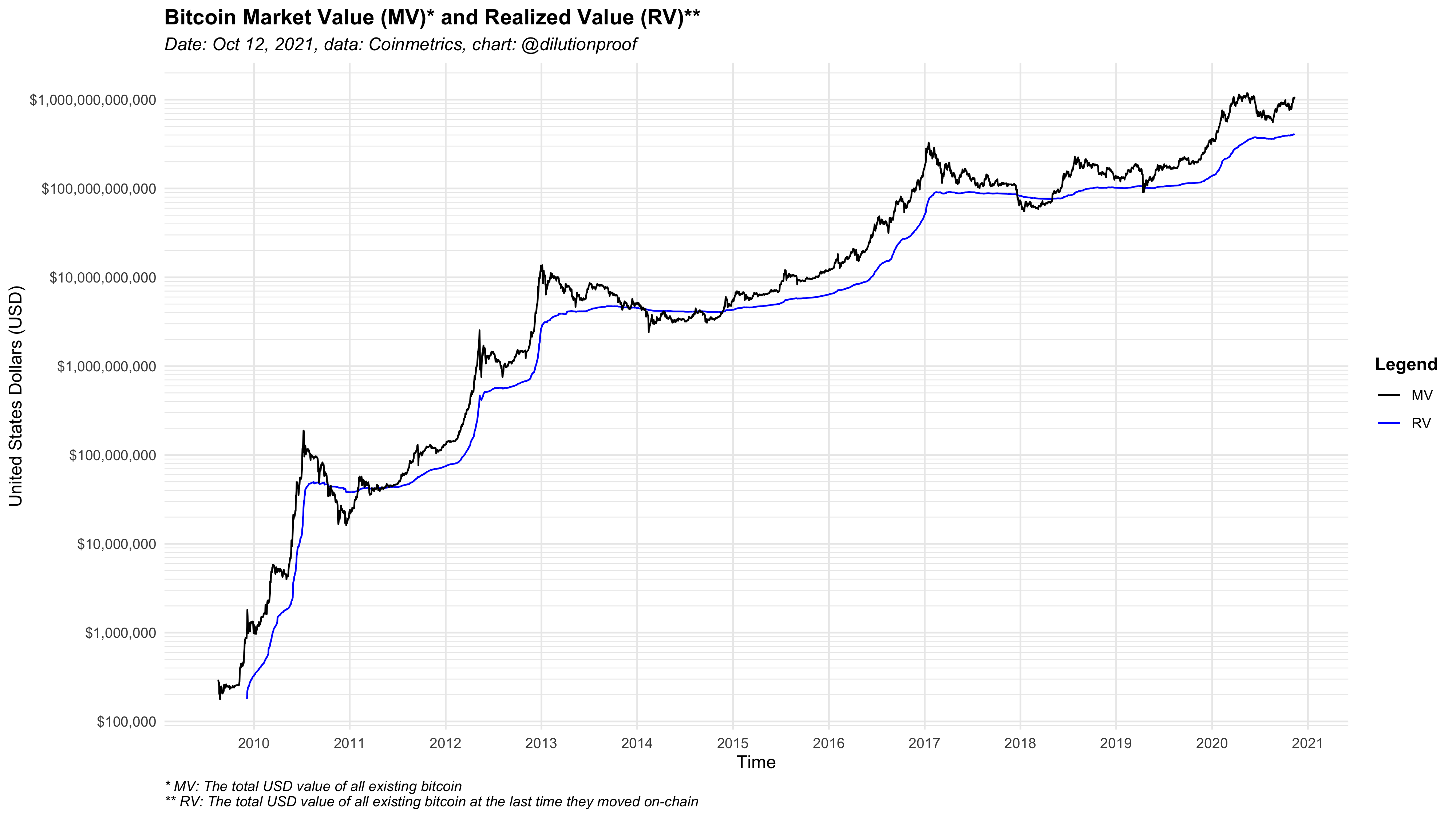 On September 23, 2018, at the Baltic Honeybadger conference in Riga, Latvia, Nic Carter presented the concept of realized value (originally “realized cap,” but both terms are since then used interchangeably) that he had developed in collaboration with Antoine Le Calvez. By leveraging the Bitcoin timechain, which holds a public record of all Bitcoin transactions that were ever made, realized value looks to quantify the total United States dollar (USD) value of all bitcoin that existed at the last time those coins were moved on-chain. Figure 1 displays this realized value (blue) alongside the total bitcoin market value (black), which is the total market value of all bitcoin that exist at any point in time.