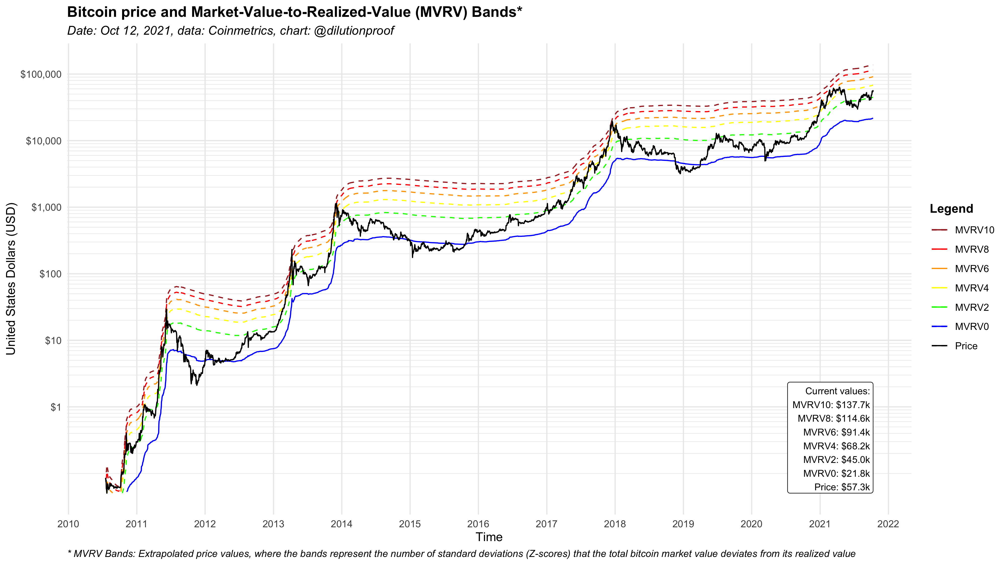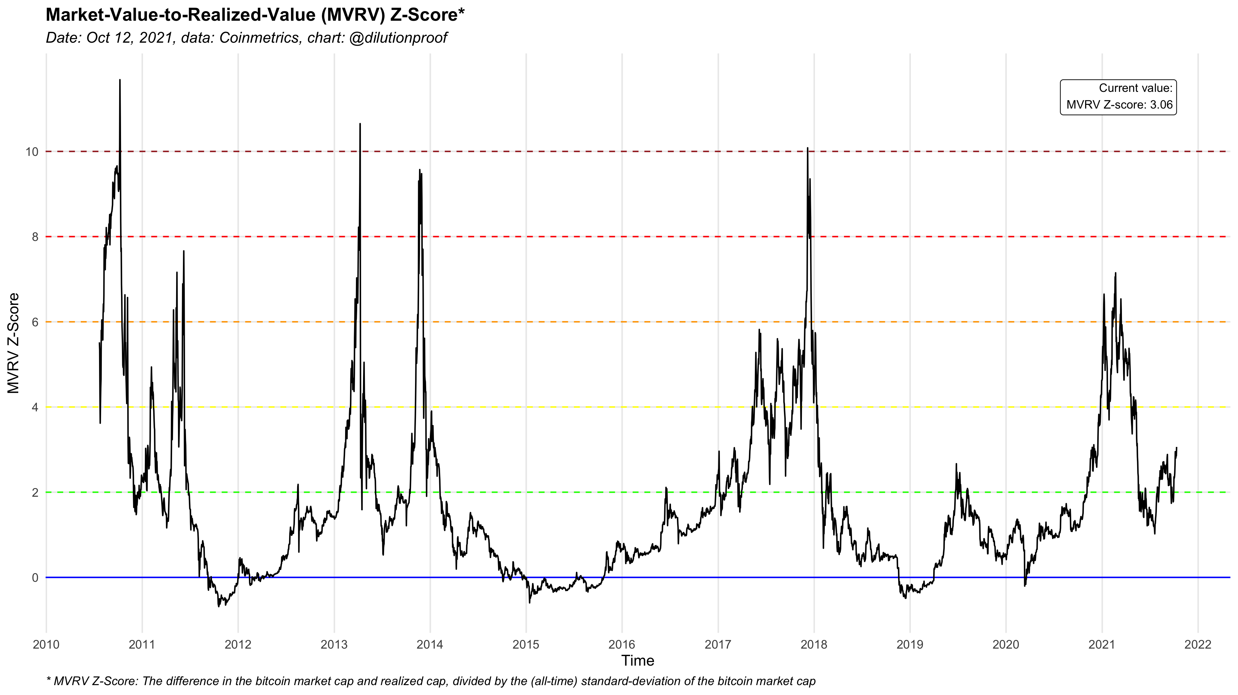 Figure 2 displays the MVRV z-score over time. The colored horizontal lines represent MVRV z-scores of 0 (blue), 2 (green), 4 (yellow), 6 (orange), 8 (red) and 10 (brown).