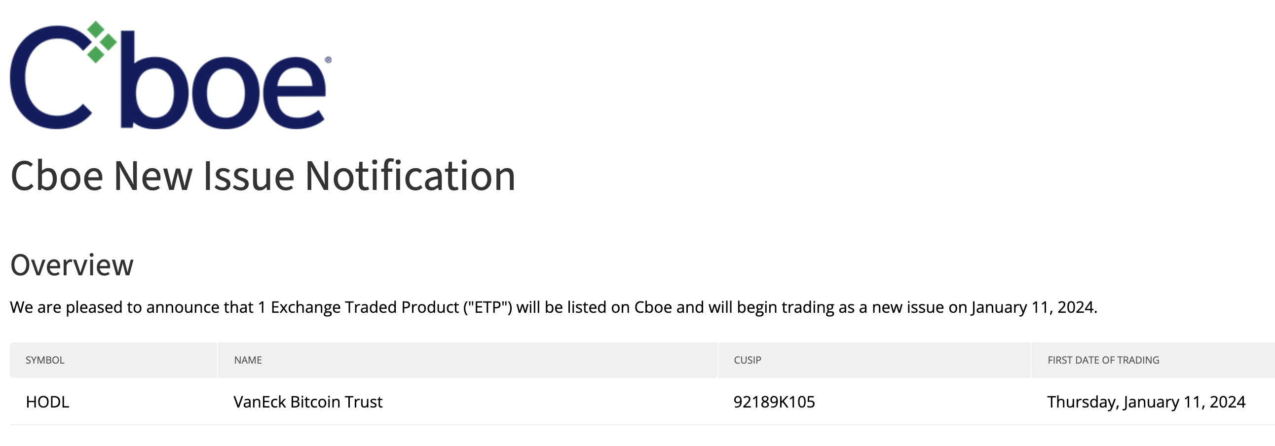 The Chicago Board Options Exchange (CBOE) has declared on their website that VanEck, Fidelity, and ARK 21Shares Spot Bitcoin Exchange-Traded Funds (ETFs) will officially commence trading starting tomorrow, pending regulatory approval and effectiveness.