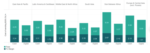 Looking further by comparing the “costs for remittance services among different regions, by breaking down the cost into two components: fee and foreign exchange (FX) margin. Within each region, as displayed below, it differentiates between digital and non-digital remittances. It shows fees account for a large portion of the costs for remittance services. Moreover, costs for non-digital services are consistently higher than those for digital services regardless of the region where the money is being sent to.”