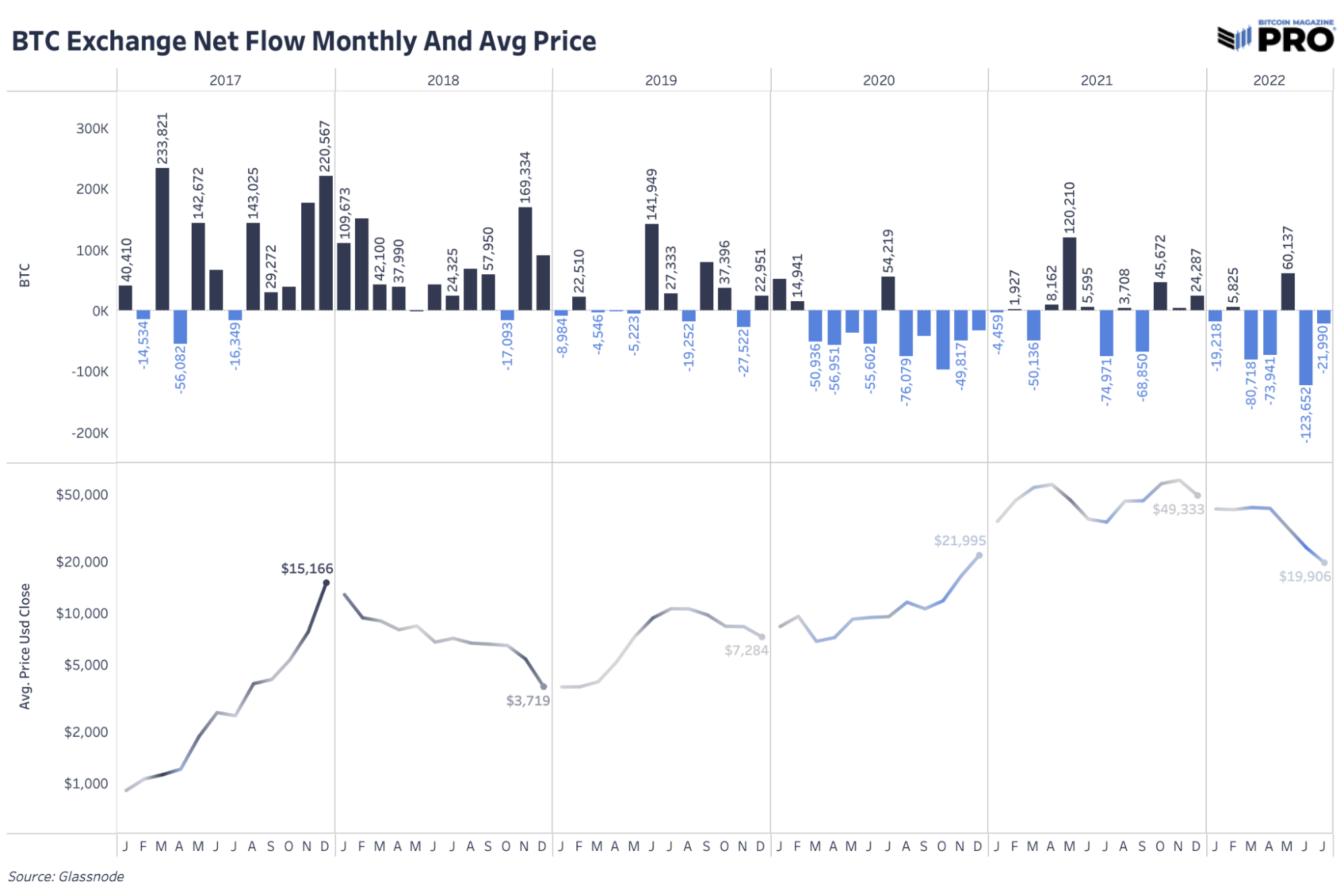 While these monthly outflows were a record in bitcoin terms, in dollar terms it was not, with April and September 2021 along with April of 2022 boasting larger amounts of net outflows in dollar terms. While it is insightful to denote figures in both dollar and bitcoin terms, we prefer to use bitcoin terms to keep measurement consistent across time periods.
