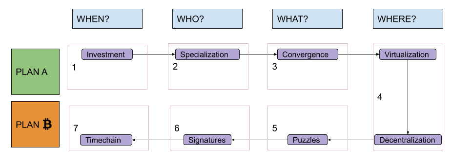The second part is labeled “Plan ₿” (yes, you guessed it: the “₿” stands for Bitcoin): It starts from the messy situation that Plan A got us stuck in, approaching state-of-the-art Bitcoin development. The “Where?” part is the conjunction (and turning point) between the two plans. Something like this: