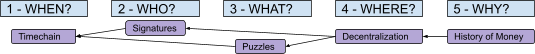 There were two problems with this model, the first being ordering: Each step was presented as necessary to “fix” the next one, in a sort of reversed causal chain, but the full picture became clear only at the end. It would have been more natural to flip it, starting from some monetary history in “Why?,” going through failed attempts at building centralized alternatives to fiat money in “Where?,” introducing decentralized value issuance in “What?” and decentralized ownership transfer in “Who?,” and finally ending with decentralized unique chronology in “When?”