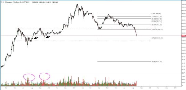 The 127% Fib extension of the most recent bullish rally on ETHUSD reveals a likely target for this capitulation. Historically, this price level (the $230 area) has also served as a key area for buyer interest to step in: