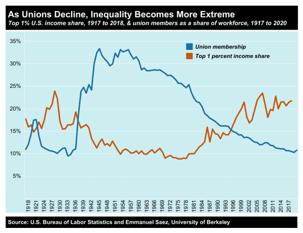 Union participation rates in the U.S. have declined from their peak of 35% in 1945 to 10% in 2020 while income, wealth, and opportunity gaps haven’t been this inequitable since before the Great Depression.