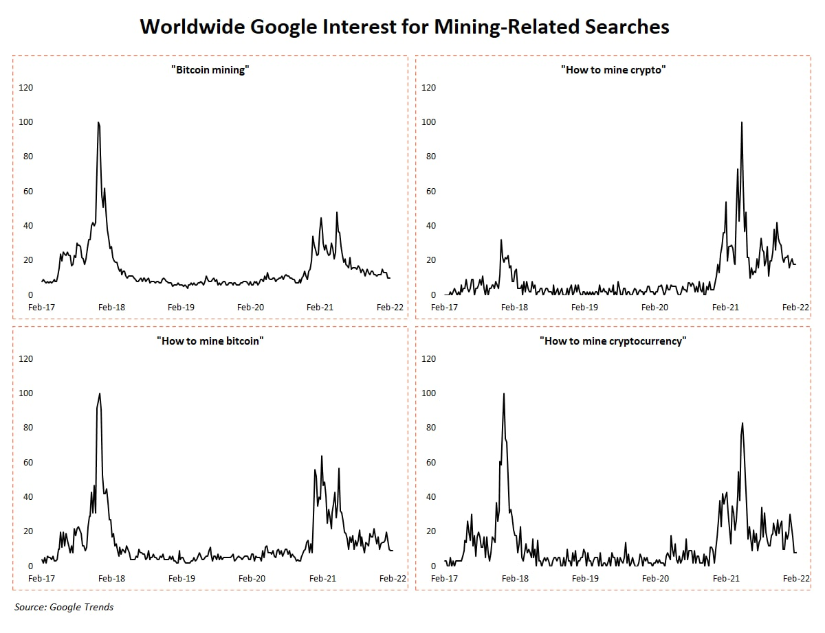 Bitcoin mining’s subreddit rocketed from 40,000 subscribers to more than 80,000 by the end of 2021 and continues to climb through February. Before January 2021, that same subreddit took more than three years to double its subscriber count.