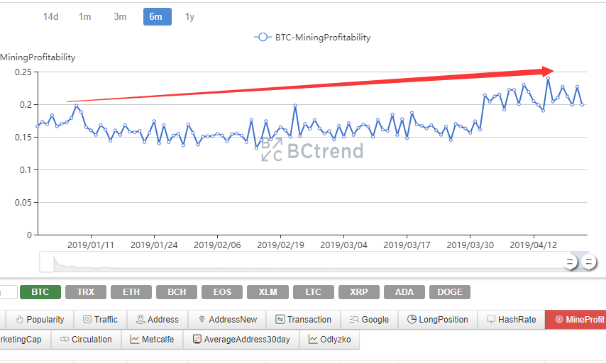 The recent bitcoin rally has driven bitcoin mining profits. Profits earned from bitcoin mining have seen a clear rise since the start of April 2019 and hit a near half-a-year high on April 15, 2019.