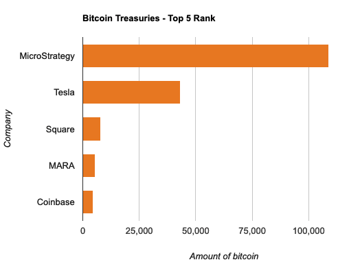 Tesla sits in second place, still holding the 43,200 bitcoin it acquired at the beginning of 2021. The electric car maker is followed by Square, Marathon Digital Holdings, and Coinbase. The fintech payment solutions firm holds a little over eight thousand BTC, whereas the bitcoin miner MARA has allocated 5,425 bitcoin to its balance sheet. Coinbase, the largest U.S. exchange, closes up the top five with a shy 4,487 bitcoin bag.
