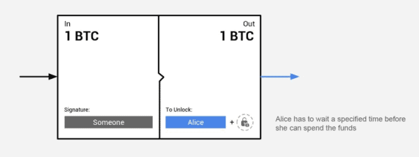 In the example below, someone put 1 BTC in, but in order for Alice to get it out, she has to wait a predefined time.